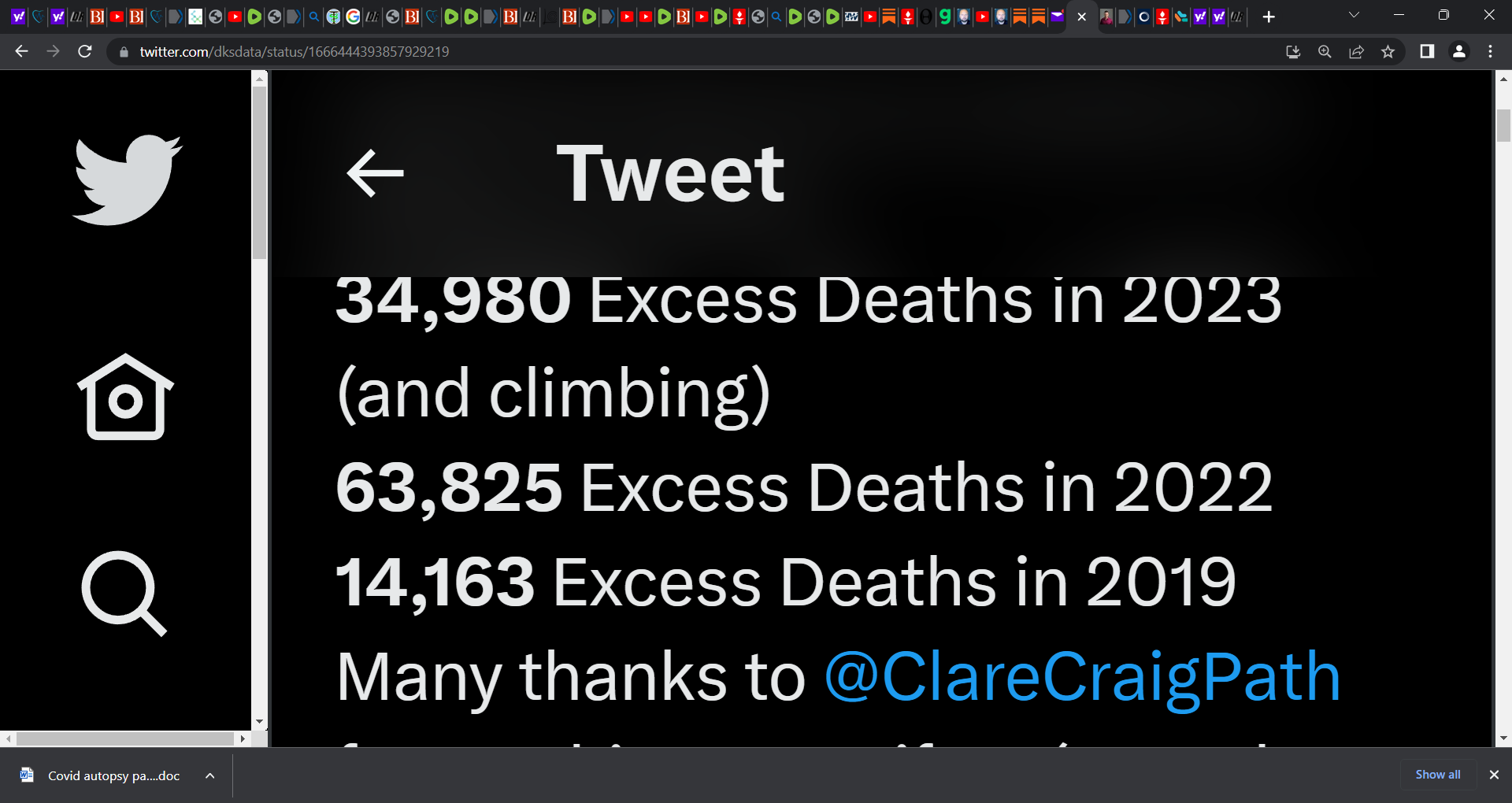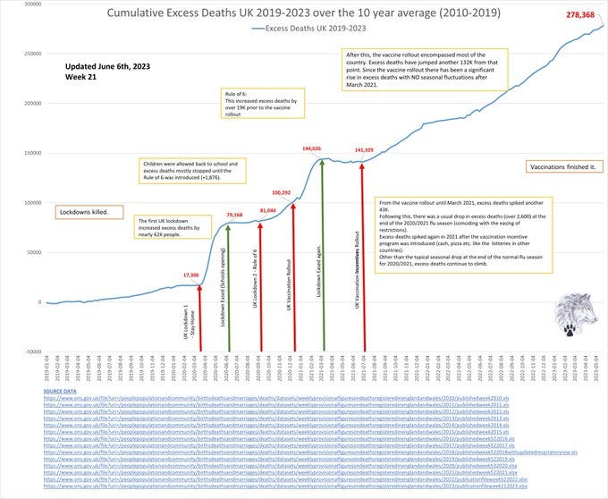 34,980 Excess Deaths in 2023 (and climbing); 63,825 Excess Deaths in 2022; 14,163 Excess Deaths in 2019; means projected over 80,000 excess deaths for entire 2023, at least! Malone? Kariko? Somebody?