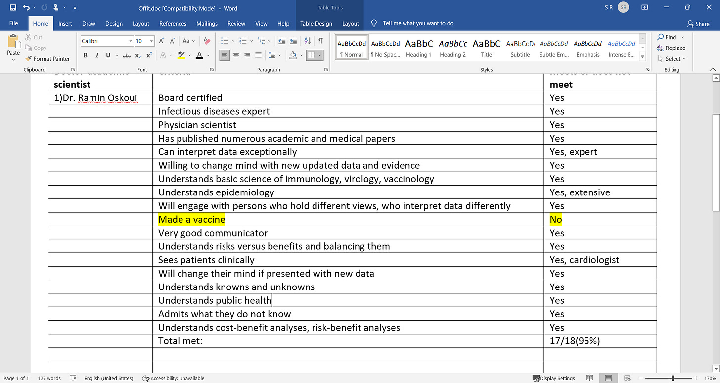 Dr. Ramin Oskoui, meets 95% of algorithm to decide if can lead FDA, CDC etc. & make key vaccine decisions; equals Ladapo, McCullough, Risch etc.; even Offit does well; Fauci, Ashish Jha, Rochelle FAIL