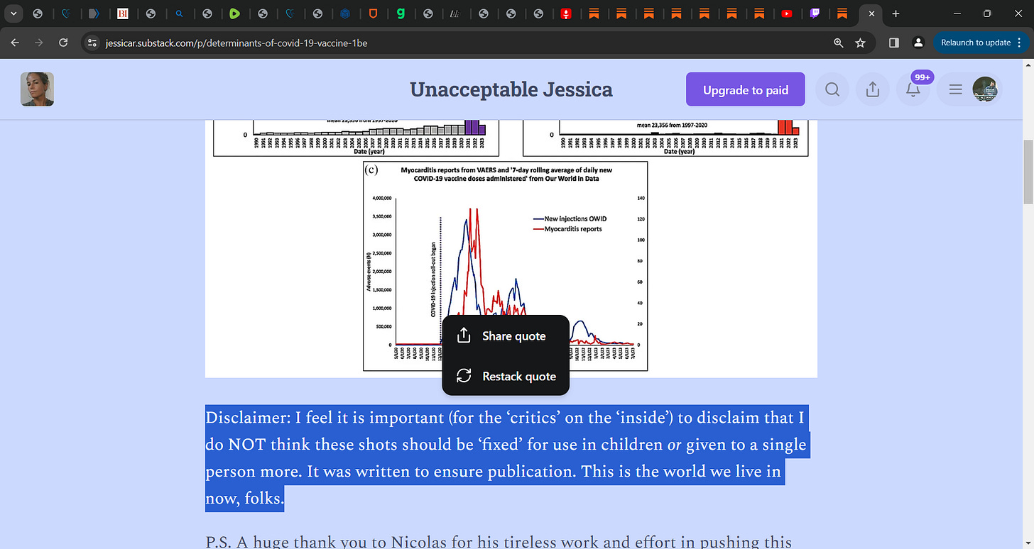 I refer to several places but here in particular. Do not write that ‘The risk-benefit imbalance substantiated by the evidence to date contraindicates further booster injections and suggests that, at a minimum, the mRNA injections should be removed from the childhood immunization program until proper safety and toxicological studies are conducted. Federal agency approval of the COVID-19 mRNA vaccines on a blanket-coverage population-wide basis had no support from an honest assessment of all relevant registrational data and commensurate consideration of risks versus benefits. Given the extensive, well-documented SAEs and unacceptably high harm-to-reward ratio, we urge governments to endorse a global moratorium on the modified mRNA products until all relevant questions pertaining to causality, residual DNA, and aberrant protein production are answered.’