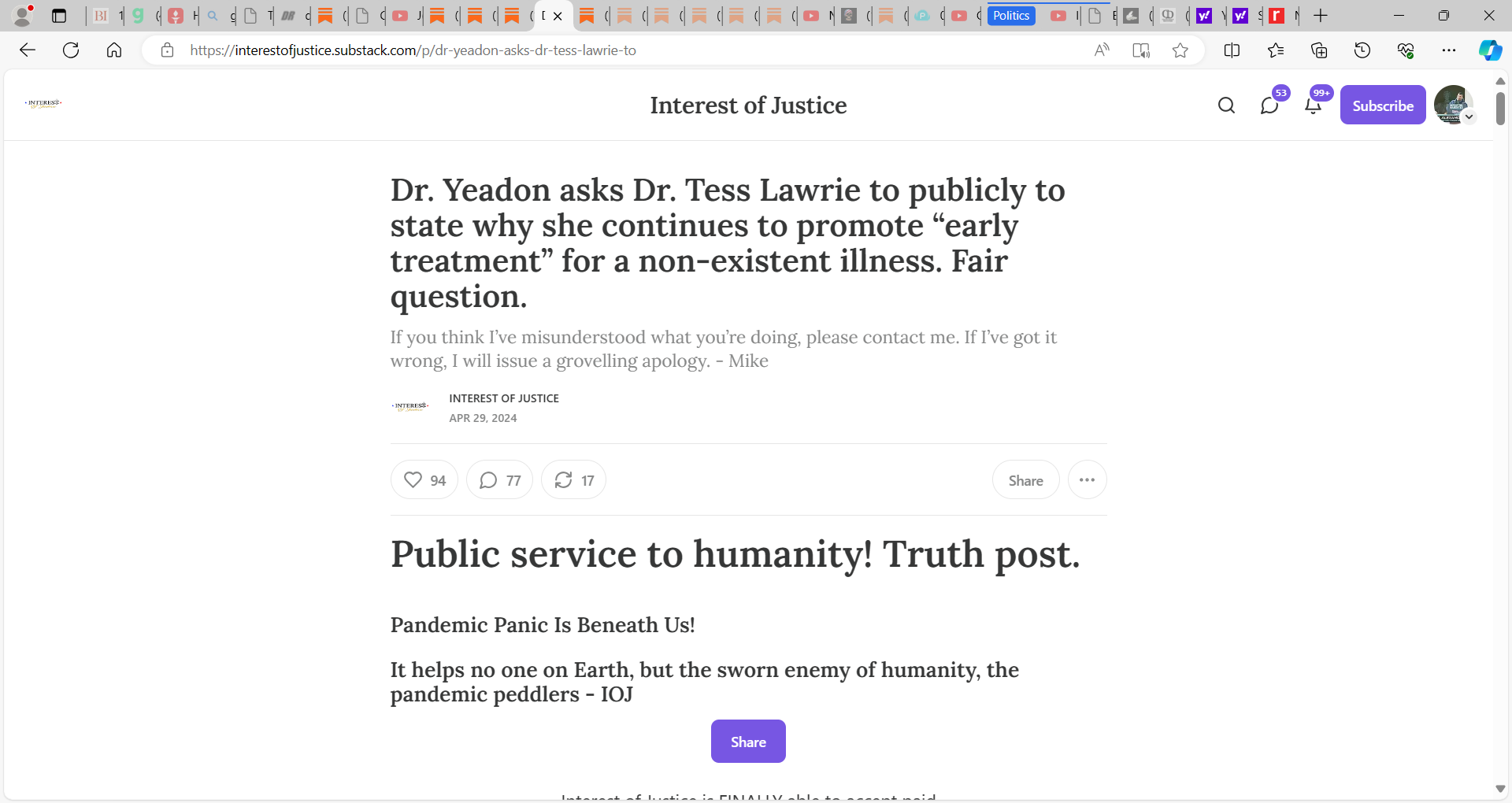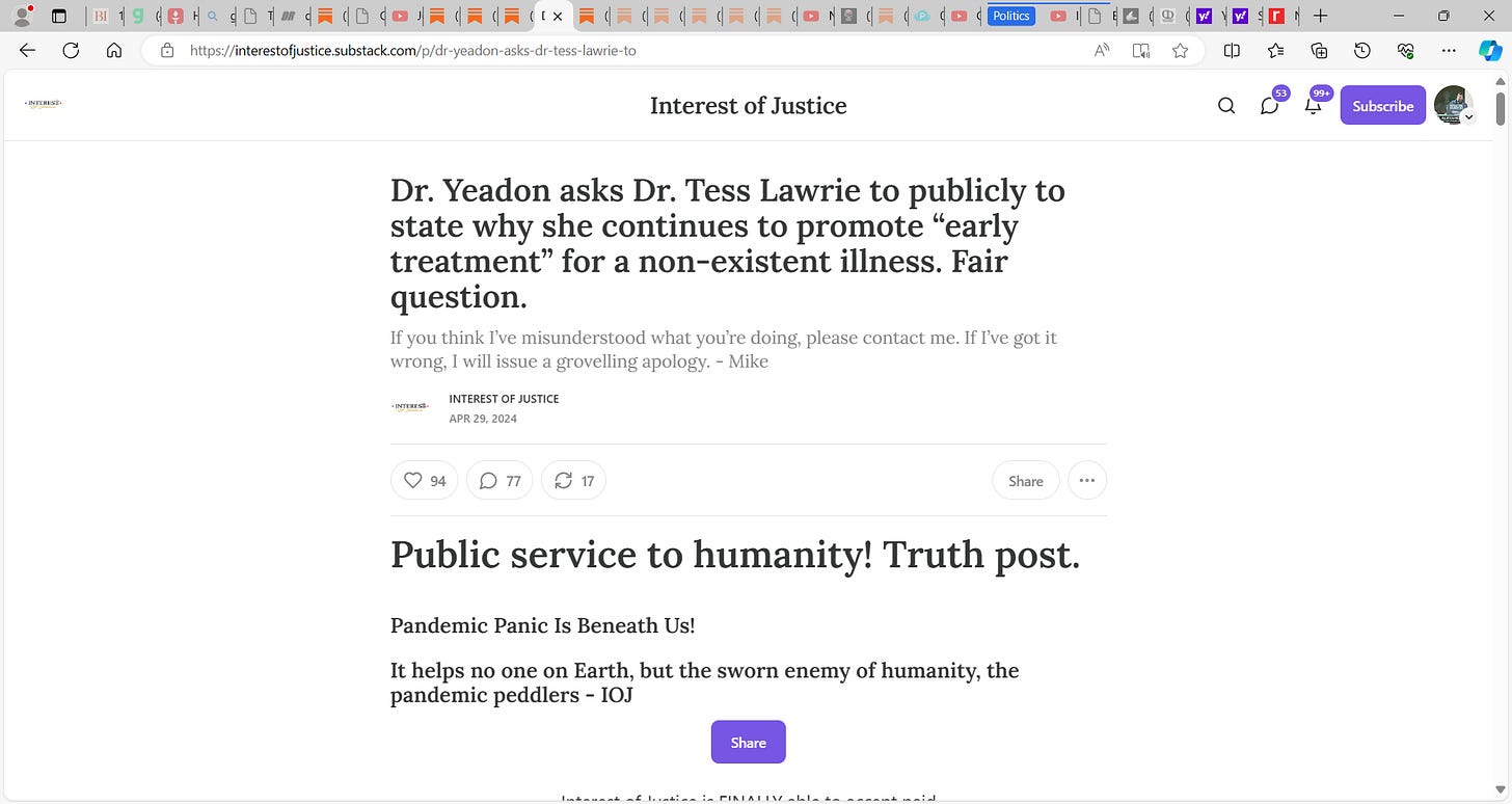 Dr. Yeadon asks Dr. Tess Lawrie to publicly to state why she continues to promote “early treatment” for a non-existent illness. Fair question. (Interest of Justice); IMO, early treatment had, has a