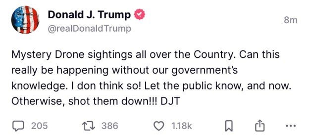[1] Mystery drone invasion sparks 'state of emergency' in New Jersey with warning Iranian mothership lurks offshore | Daily Mail Online This is a good insight into the chaotic non-response by the U.S. Government as well as some photos.