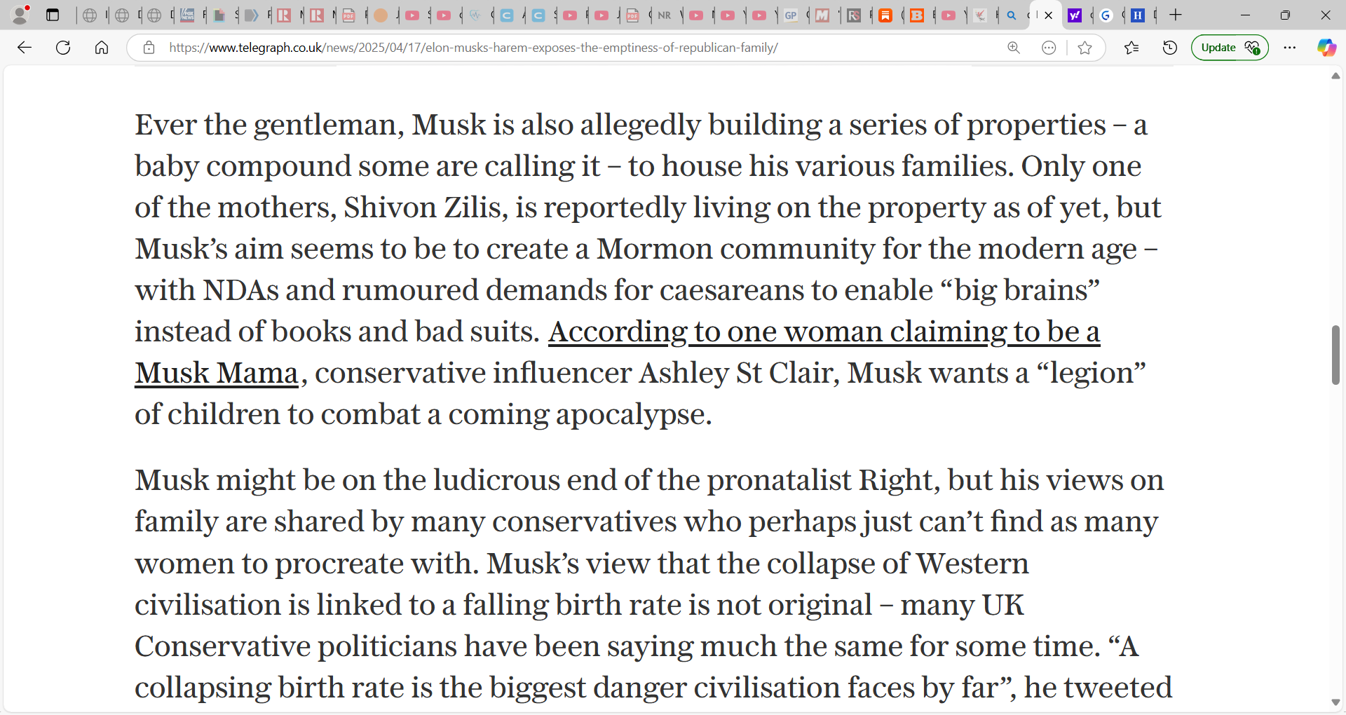 Musk might be on the ludicrous end of the pronatalist Right, but his views on family are shared by many conservatives who perhaps just can’t find as many women to procreate with. Musk’s view that the collapse of Western civilisation is linked to a falling birth rate is not original – many UK Conservative politicians have been saying much the same for some time. “A collapsing birth rate is the biggest danger civilisation faces by far”, he tweeted in 2022, sounding a bit like Miriam Cates or Jacob Rees Mogg. But does Musk really believe that Western Civilisation might be saved by the same sexual and moral practices found in a Chinese imperial harem?’