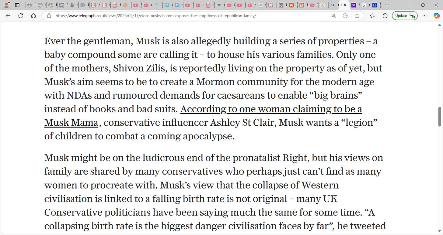 Musk is on a mission to help “seed the earth with more human beings of high intelligence,” per the Journal’s Dana Mattioli. The White House senior advisor has at least 14 children by four different mothers – though this number is thought to be higher. Conservative influencer Ashley St. Clair, one such mother, reveals how after being impregnated by Musk, he offered her “$15 million and $100,000 a month in support,” while encouraging them a “legion-level” of children “before the apocalypse.”’