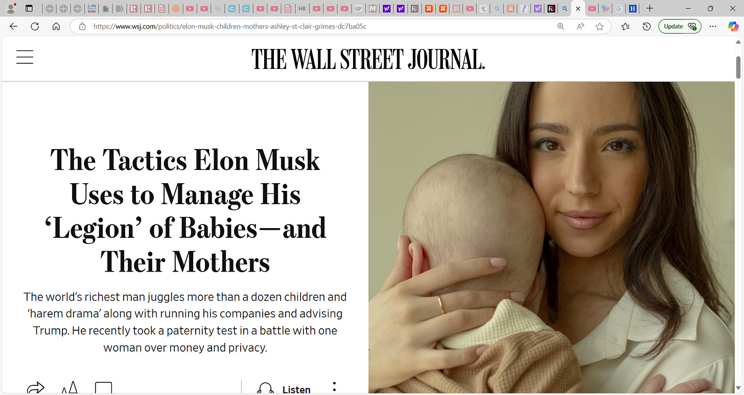 The Trump orbit tolerates this type of thing, it seems, hell if they tolerate and fete Andrew Tate, Musk is not an issue…his proclivities; The Wall Street Journal dropped a piece on ‘The Tactics Elon Musk Uses to Manage His ‘Legion’ of Babies—and Their Mothers, ‘The world’s richest man juggles more than a dozen children and ‘harem drama’ along with running his companies and advising Trump. He recently took a paternity test in a battle with one woman over money and privacy.’