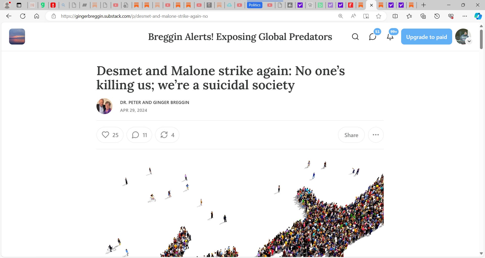 no, it is us, we are suicidal, the fault is us...Dr. Peter Breggin and Ginger Breggin puts out a well written stack 'Desmet and Malone strike again: No one’s killing us; we’re a suicidal society'