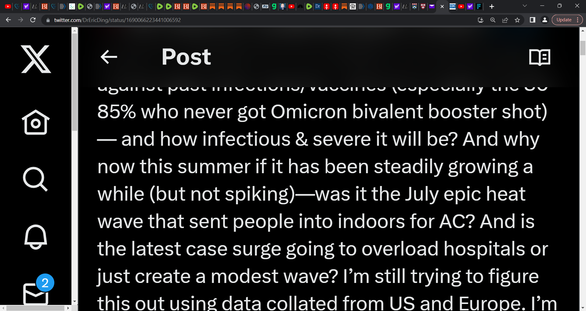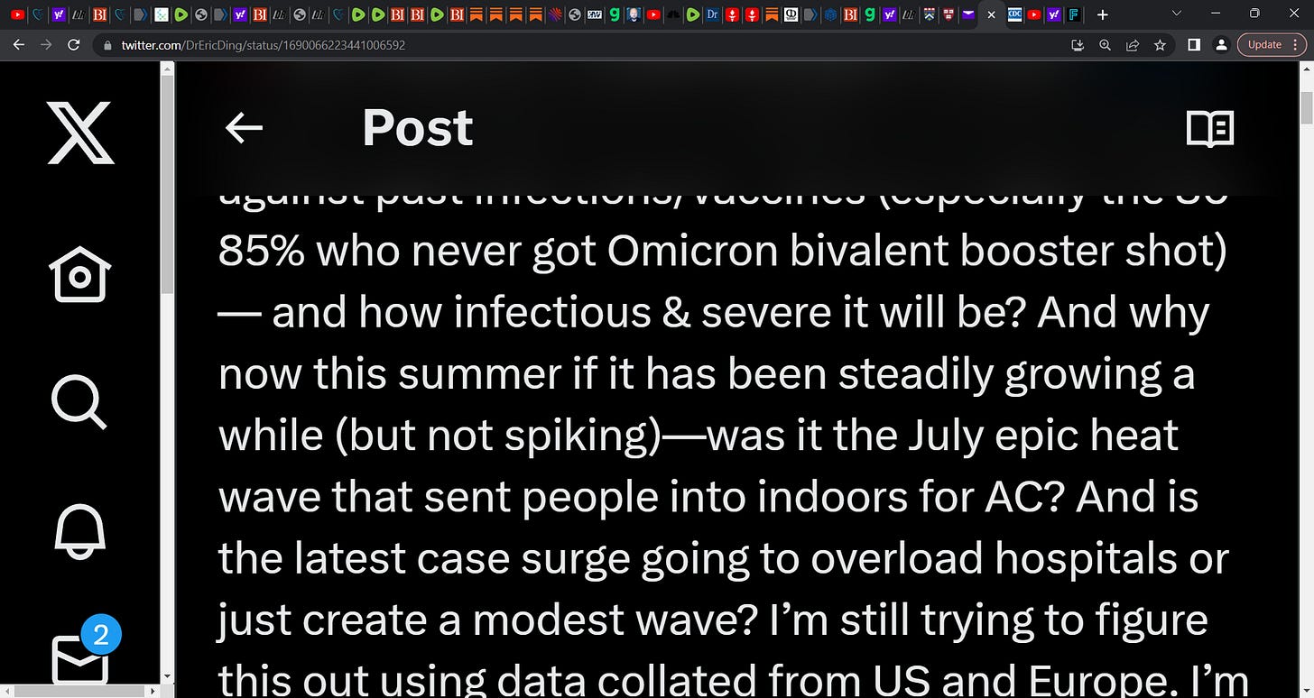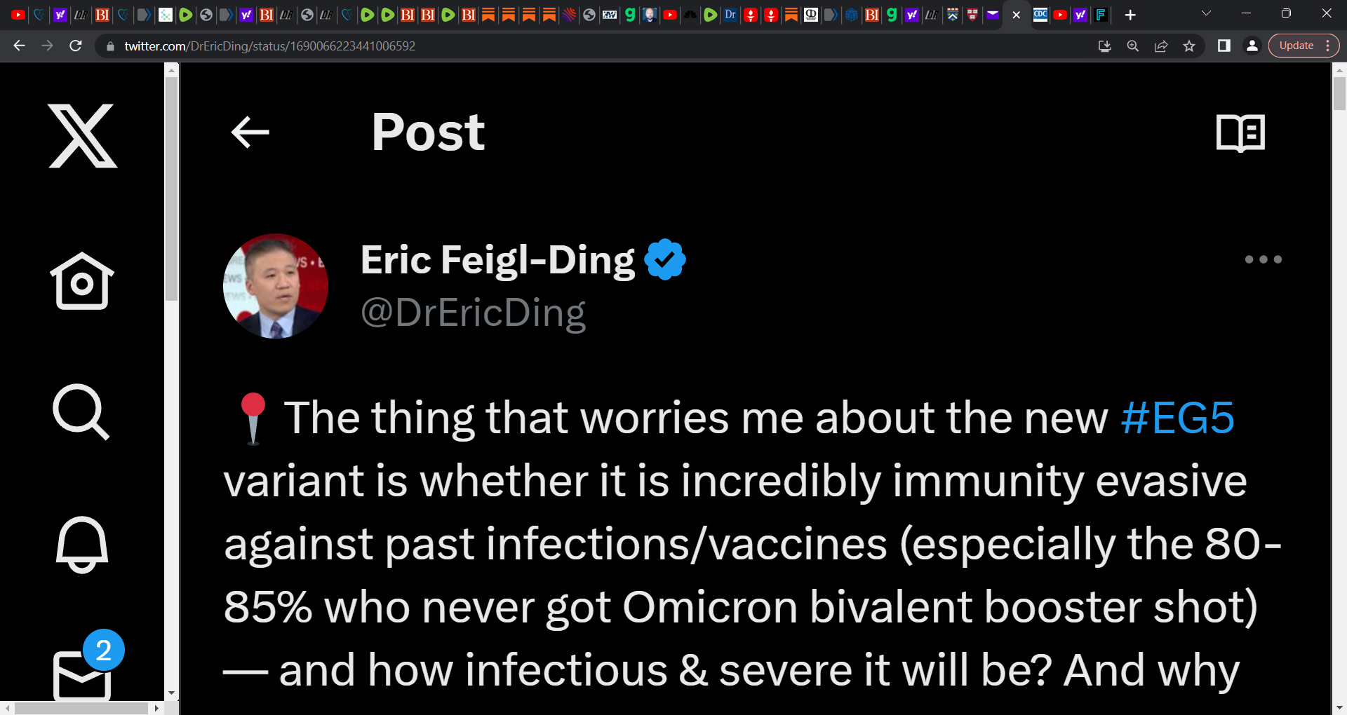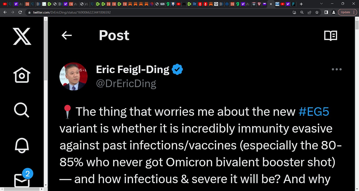 Eric was and shows how just bat-sh*t crazy he is…I just chuckle when he TWITTERS, he is deranged and inept and was always WRONG! what this EG.5 clade is showing us and likely losing dominance to FL.1.5.1 clade eventually, especially if infections are surging at this time, is that people like Geert Vanden Bossche who said a more infectious variant and potentially more lethal one would and could emerge, was CORRECT! We sidelined Geert yet he remains their guru. Freedom Movement sidelined Geert, imagine that.