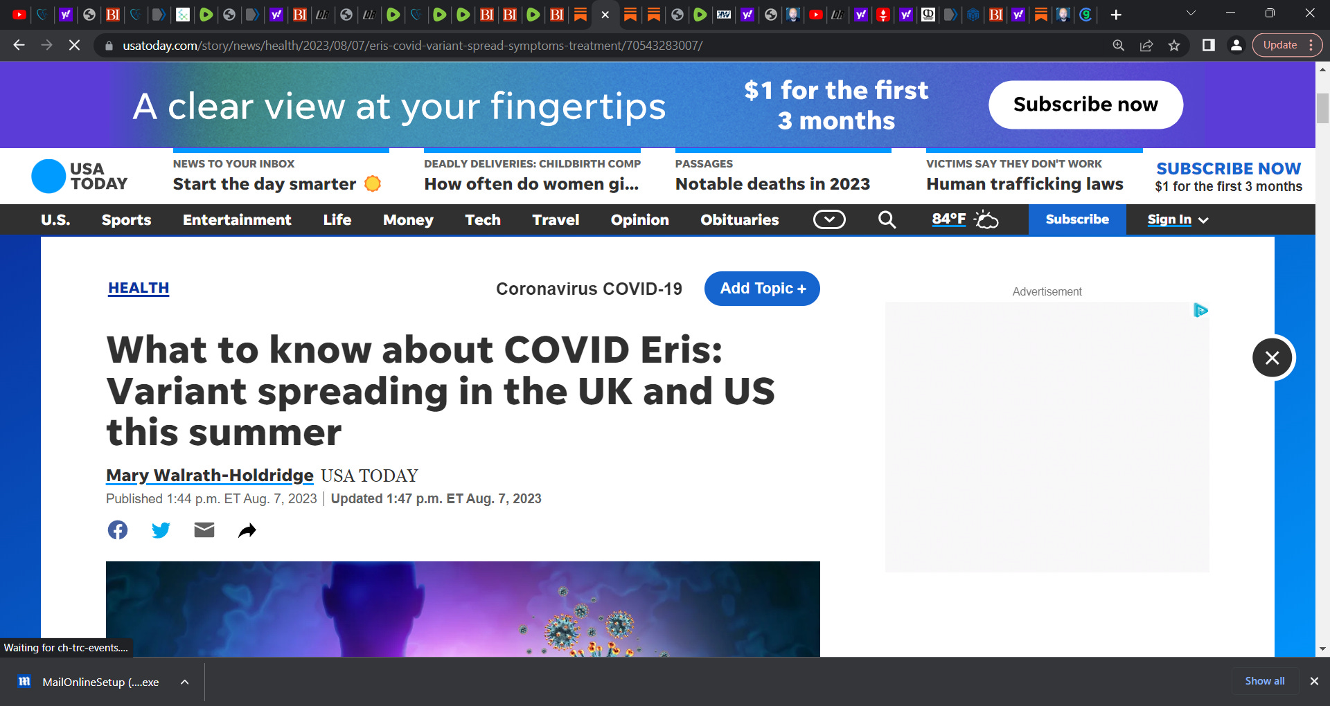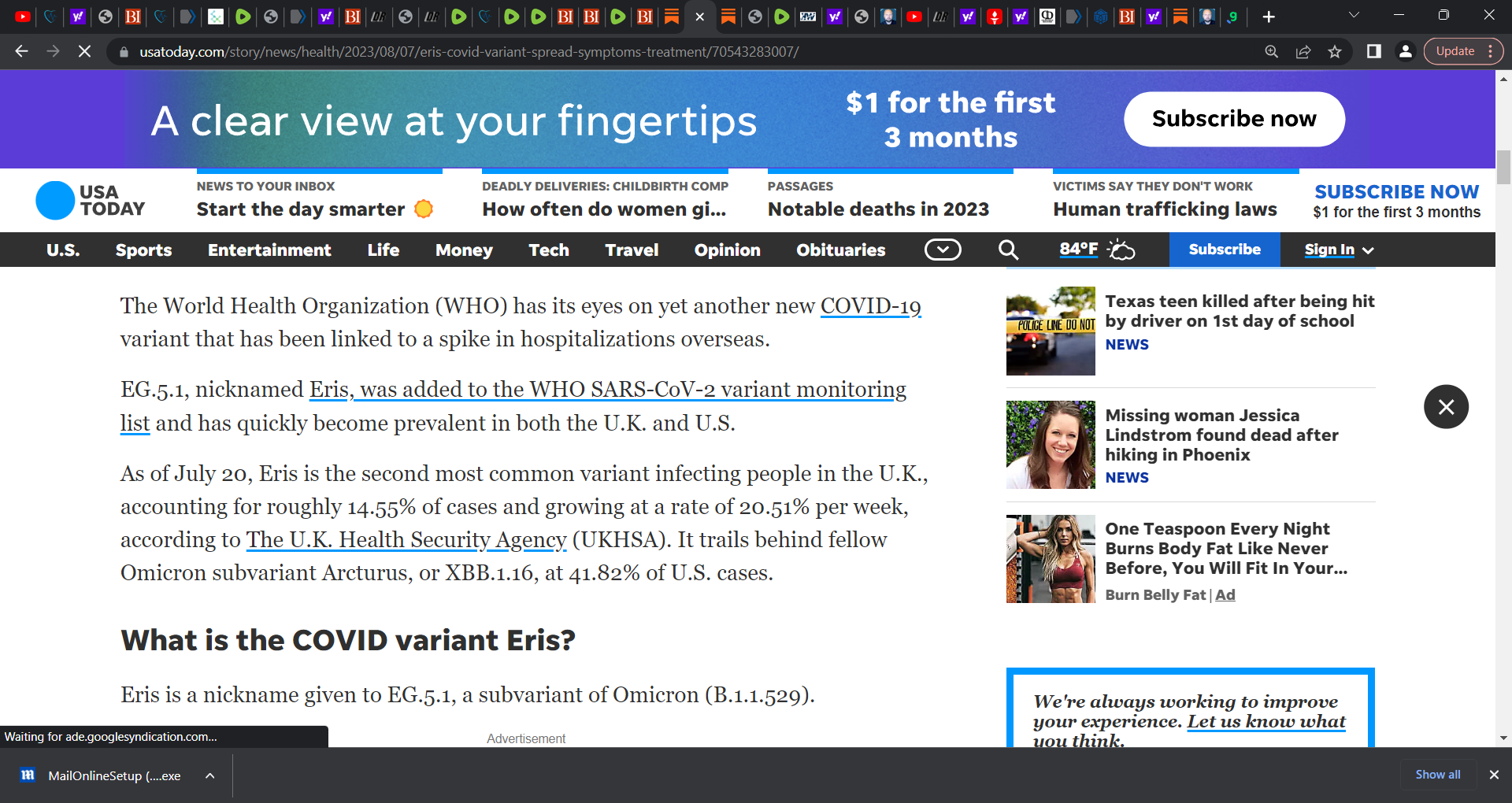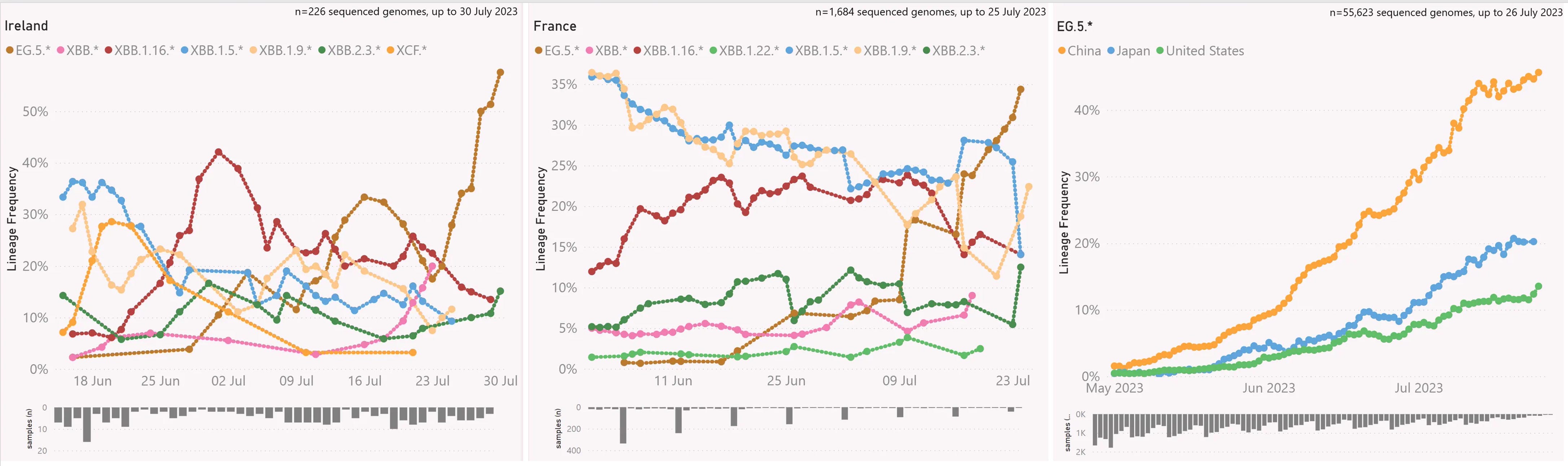 The rise of EG.5.1 is not at all confined to the United States. It’s notable throughout the UK, Europe, and Asia. The graphs below, posted by Mike Honey , show its takeoff well.