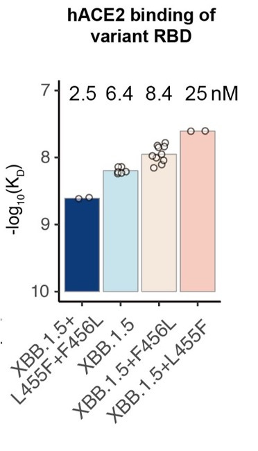 There are 2 adjacent mutations in the spike 455 and 456 positions that are showing the virus has learned a new trick. It’s being called a FLip because both mutations are between F and L: one L to F, the other F to L, such that it really is deserving of the name!, thanks to Raj Rajnarayanan for coming up with it). Together, but not alone, the spike binds more avidly to ACE2, the cell receptor for the virus (the lower the Y-axis, -logKd the tighter the binding).