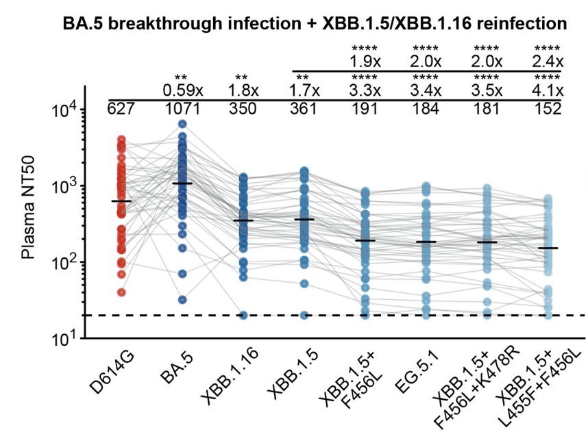 The impact of EG.5.1 for neutralizing antibodies is seen below for individuals with both BA.5 and an XBB (1.5 or 1.16) infections. You can see the drop of neutralizing antibody levels (Plasma NT50) when the F456L mutation is added to XBB.1.5 and for EG.5.1 which carries this mutation. So the EG.5.1 variant poses a challenge to our humoral (antibody) immune response.