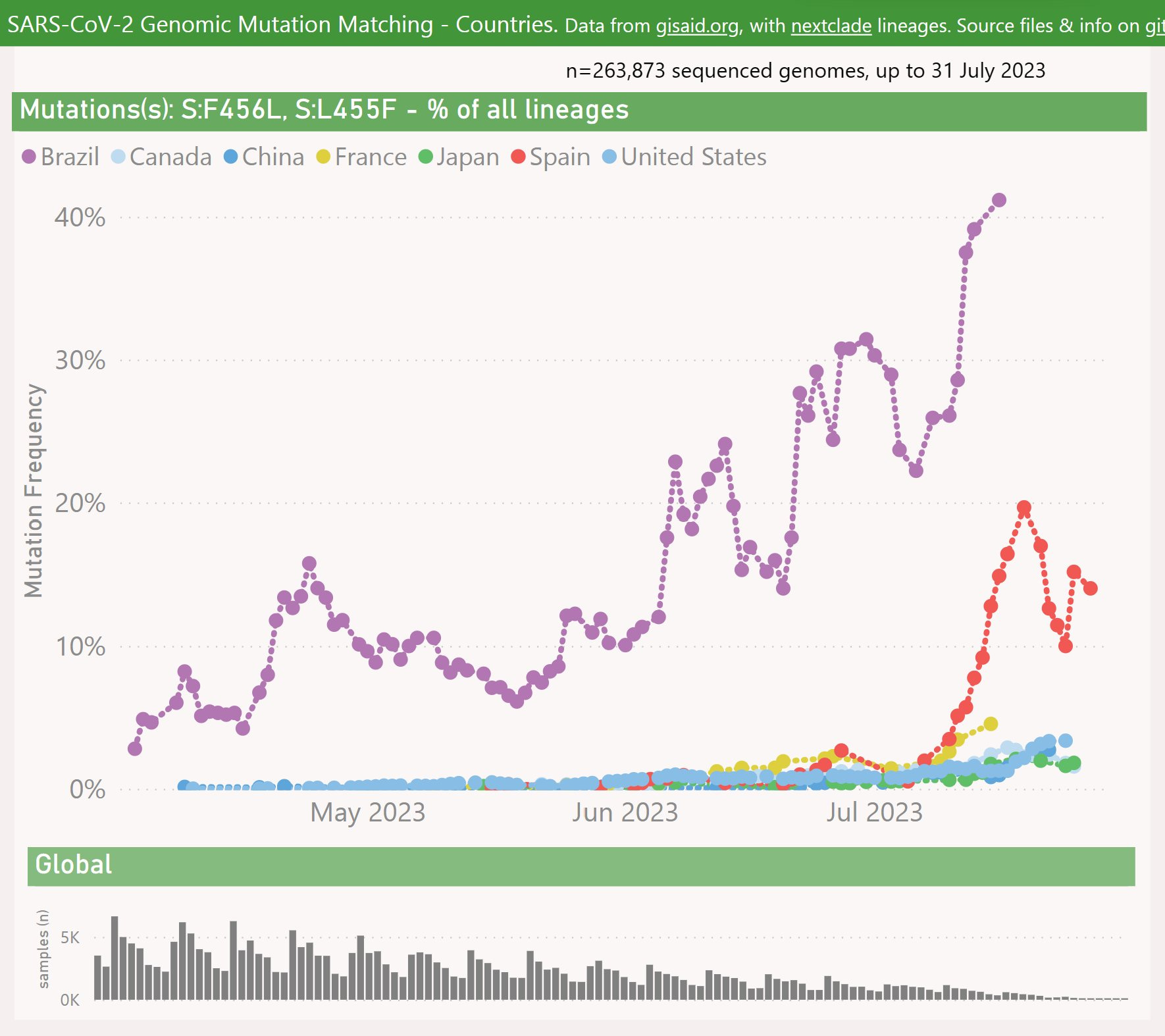 In fact, the proportion of new sequences with the key spike mutation seen in EG.5 (and FL.5.1)—F456L—is over 35% worldwide.