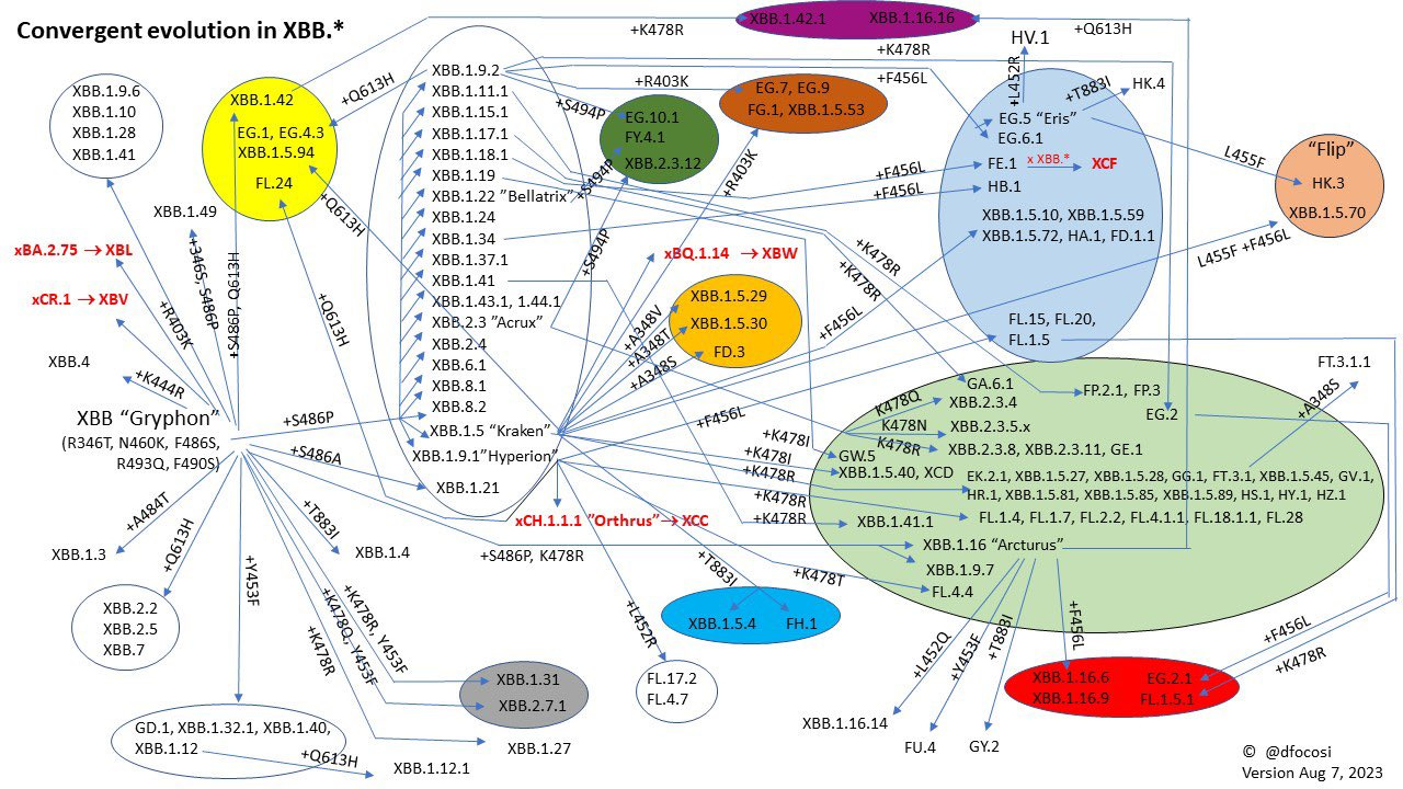 Here is Daniele Focosi’s newly updated XBB Convergence map to show the evolution of the FLip combo mutation at the far right, top, with EG.5.1 adding the L455F mutation.