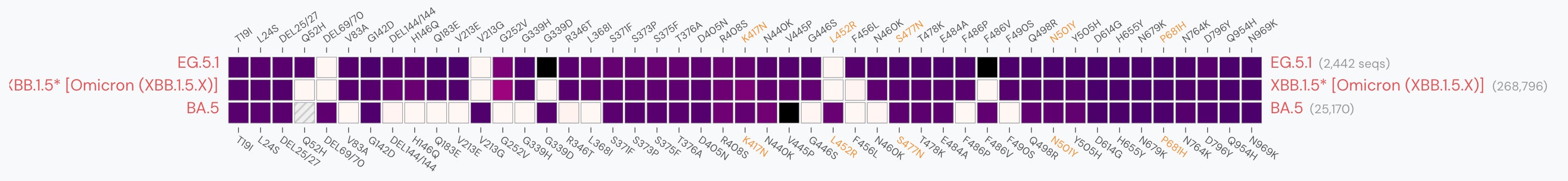 We’re not ready for EG.5.1, no less FLip. We were supposed to have new Covid booster vaccines available in August directed against XBB.1.5, the prevailing and dominant variant when the decision was made to make it the target back in May/June. Below is the spike protein mutation map for BA.5 (to which the bivalent booster shot was directed), XBB.1.5 (the target of the new booster), and EG.5.1.
