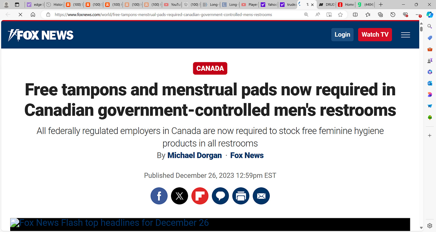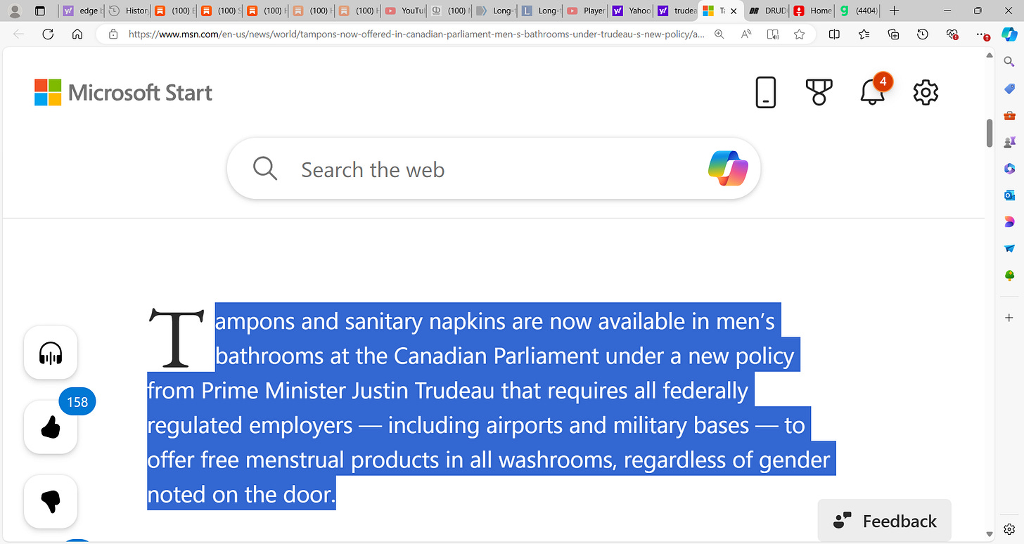 Tampon-man Trudeau (word is he uses tampons daily, exactly how, above my pay grade), wants all Canadian men to have access to feminine napkins and tampons like him…he uses them, so must for all men…fuck that, no tampons for me! I will pass on that…but there are Canadian men who will insert tampons up their ass just to be woke and say they ‘identify’, that’s how insane some Canadians are and to understand, just go back to the internet and see what they did to each other during Doug Ford’s COVID lunatic madness and Jason Kenney’s…in Ontario and Alberta and Quebec…treated each other like animals.