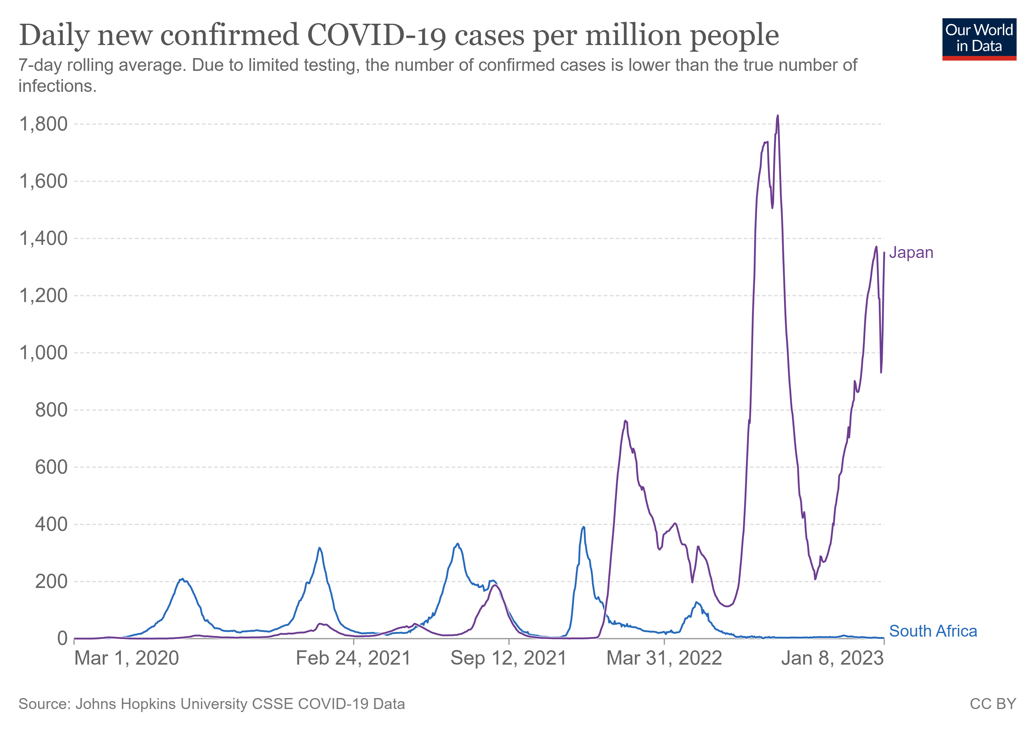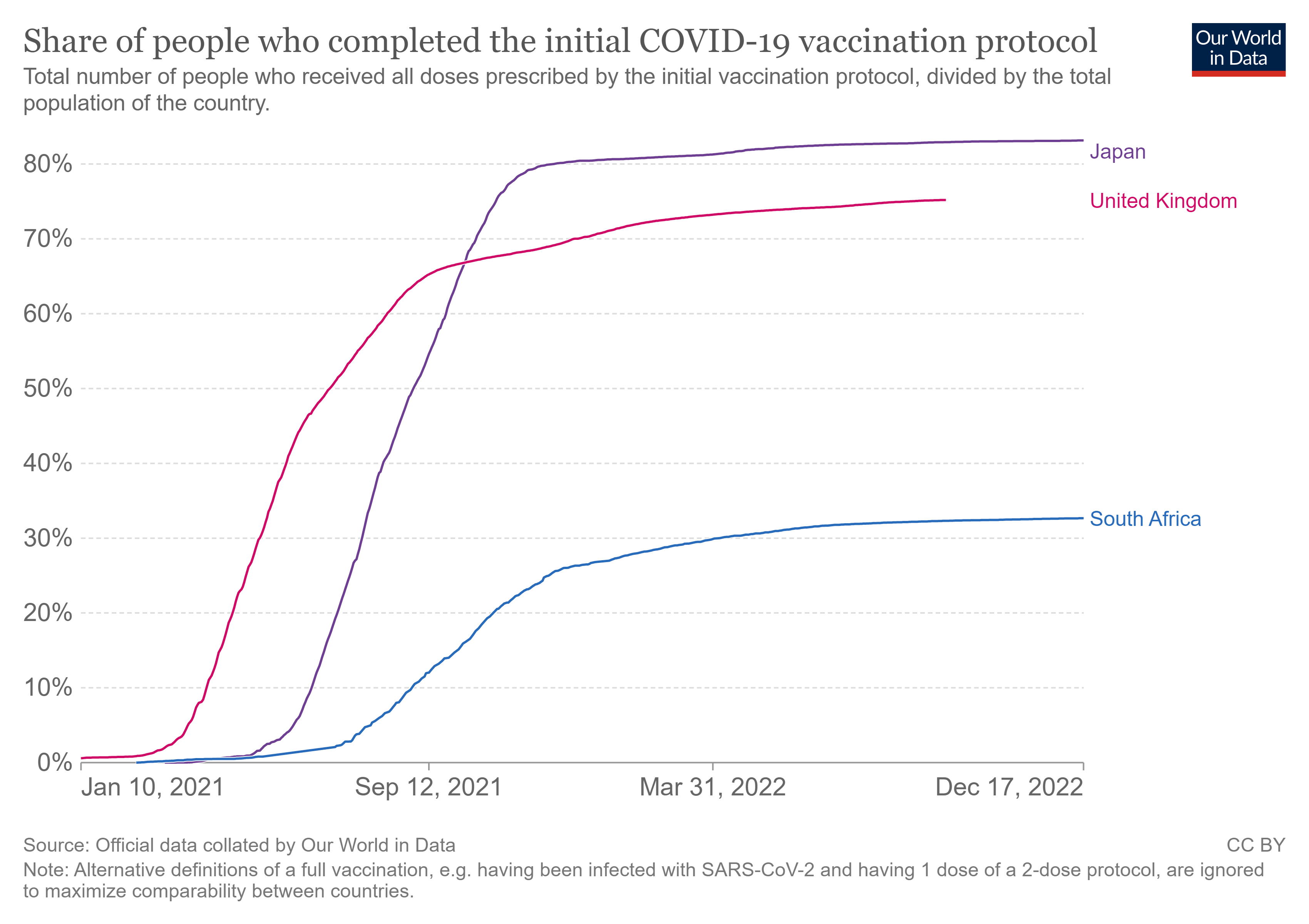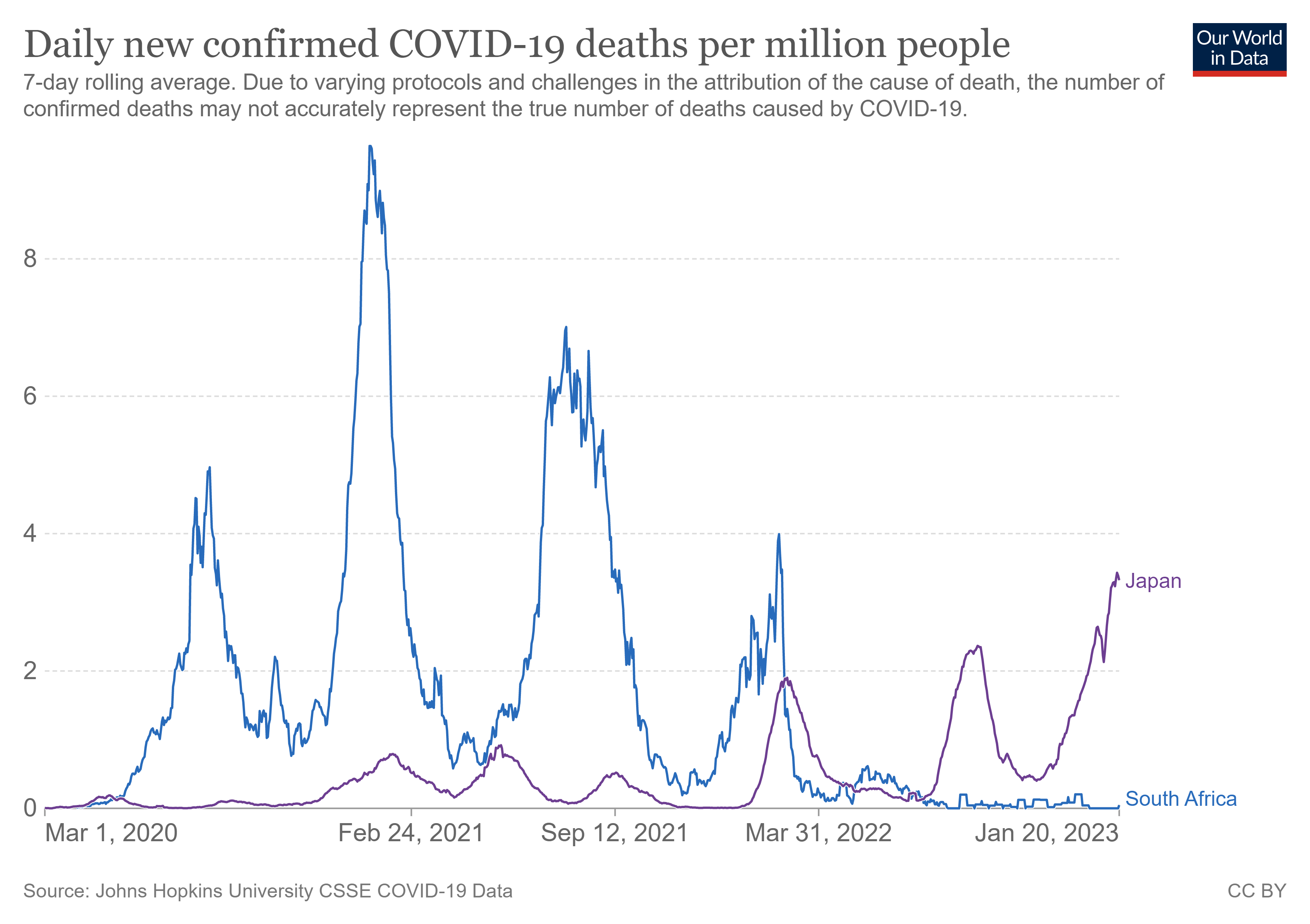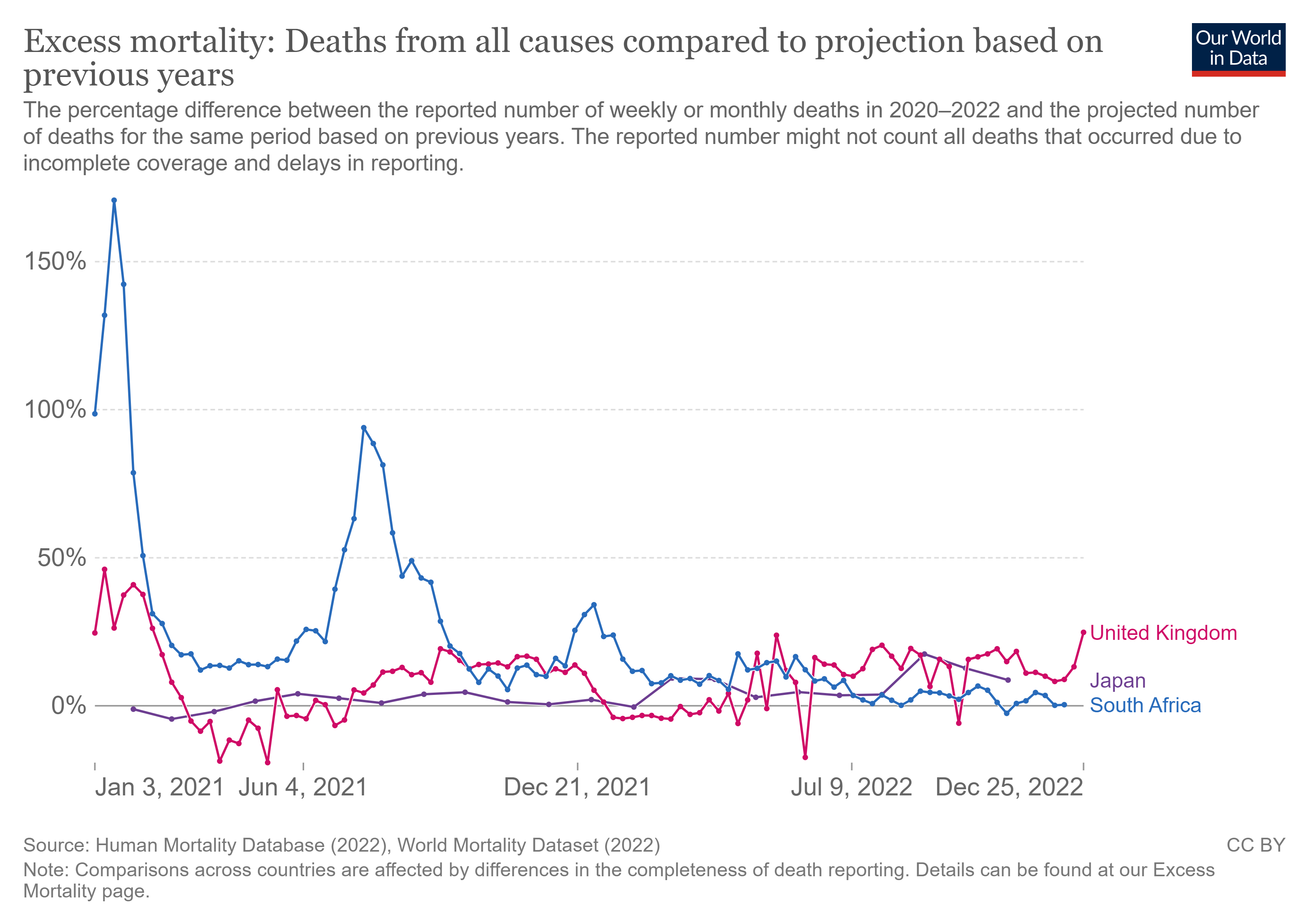Are the surges in deaths linked to the roll-out of the gene injections as well as boosters? See UK excess mortality graph below. See South Africa’s infection (and Japan’s), deaths, and vaccine uptake, as well as excess mortality today as a comparison (graph below). Note South Africa is one of the nations that took least vaccine yet had no issue with omicron etc. Is it the vaccine, stupid? Japan is finding it out the hard way as it took among the highest vaccine globally.