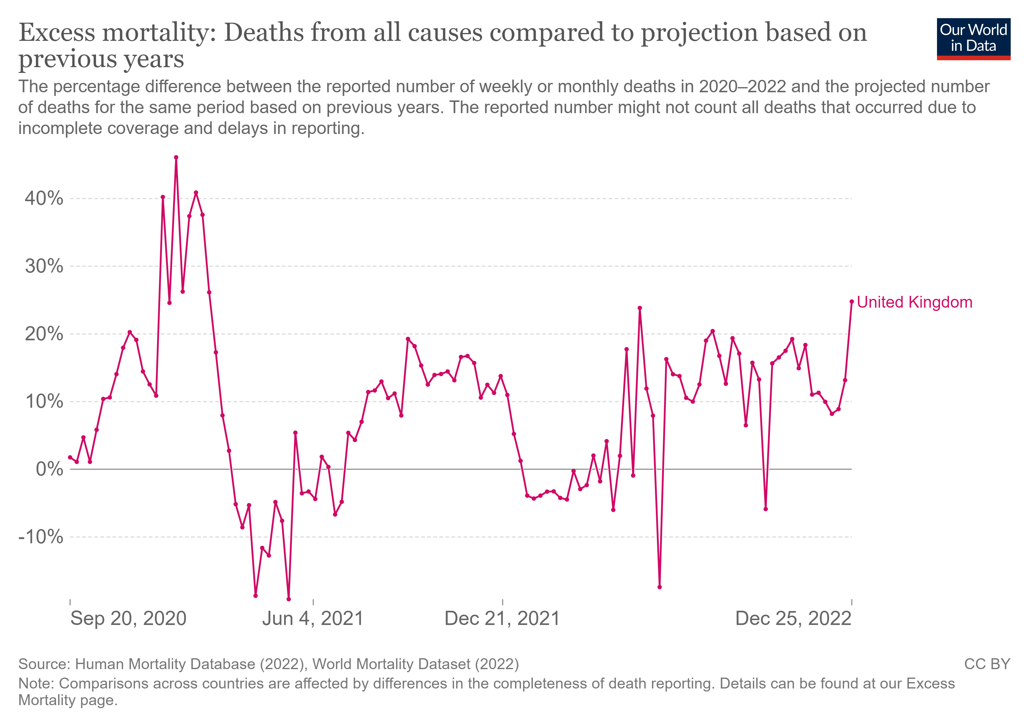 Also, 30.5% increase in deaths week ending Jan 13th 2023 over Jan 13th 2022; 16% rise in deaths week ending Jan 13th 2023 over Jan 6th 2023; why? Can excess death be due to COVID vaccine & boosters?