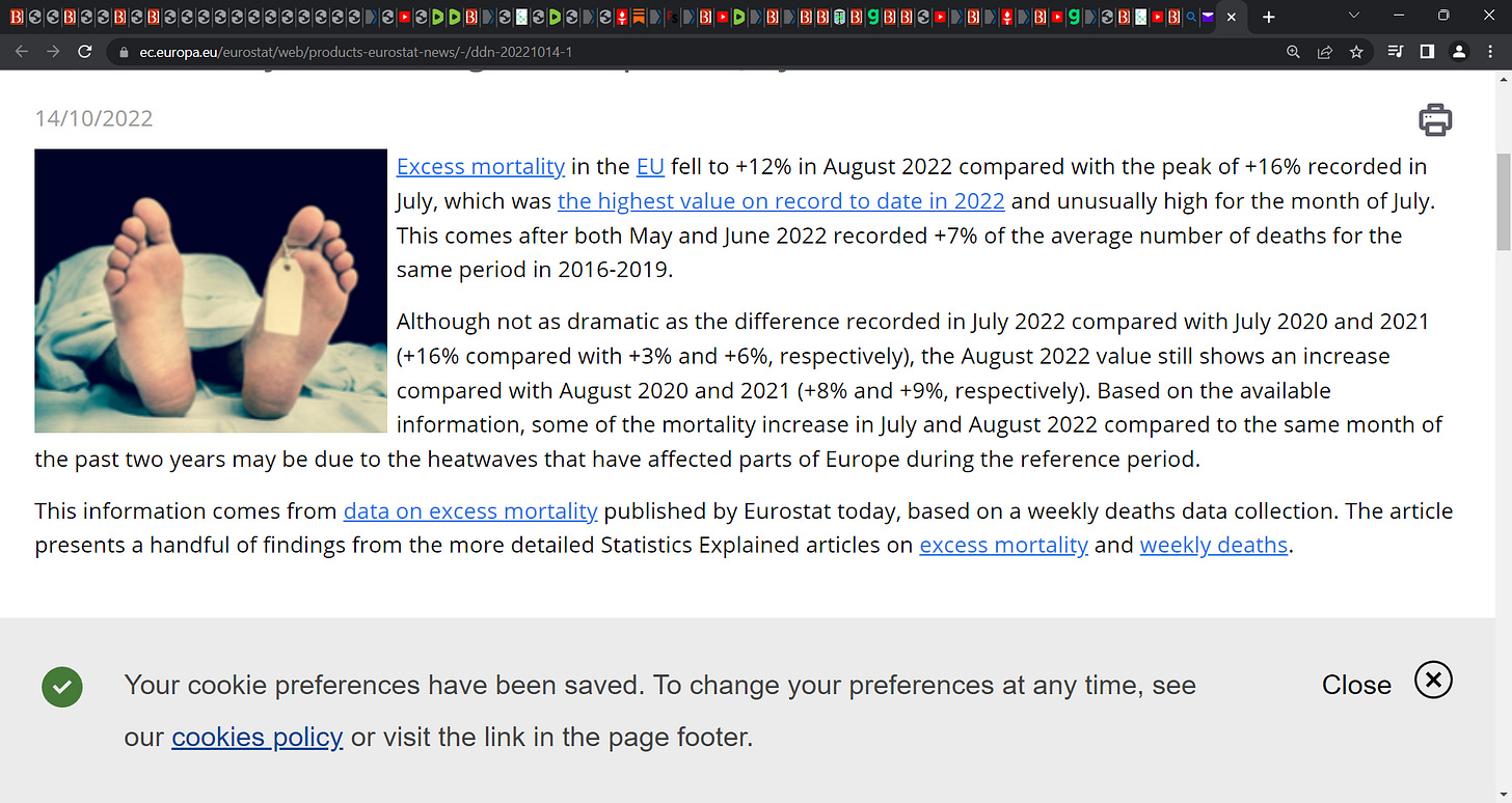 EUROSTAT: Excess mortality in EU+12% in August 2022 compared with peak of +16% recorded in July, which was the highest value on record to date in 2022 & unusually high for the month of July