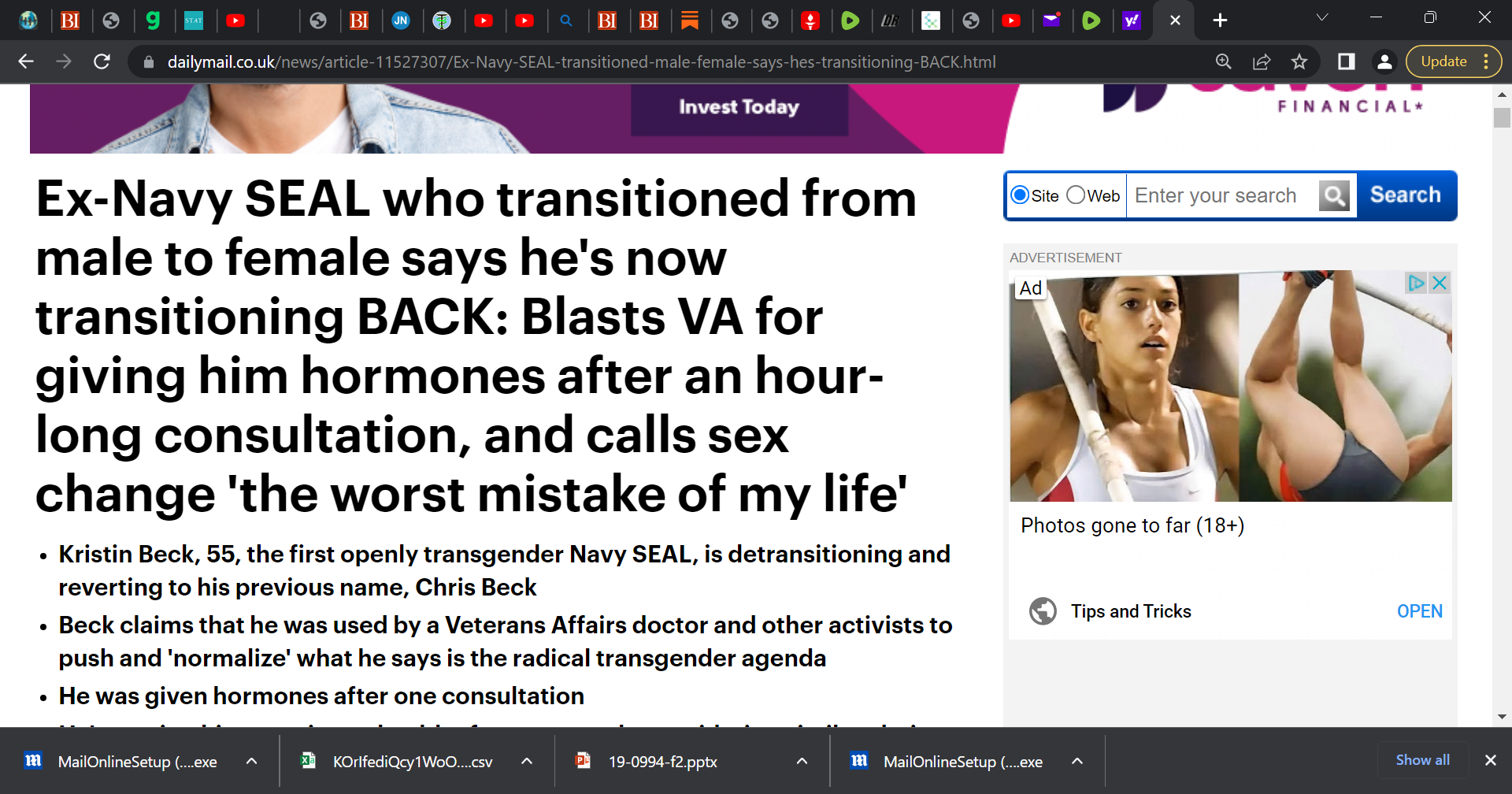 "Ex-Navy SEAL who transitioned from male to female says he's now transitioning BACK: Blasts VA for giving him hormones after an hour-long consultation"; I only hope he did not remove his xxxxx, yikes