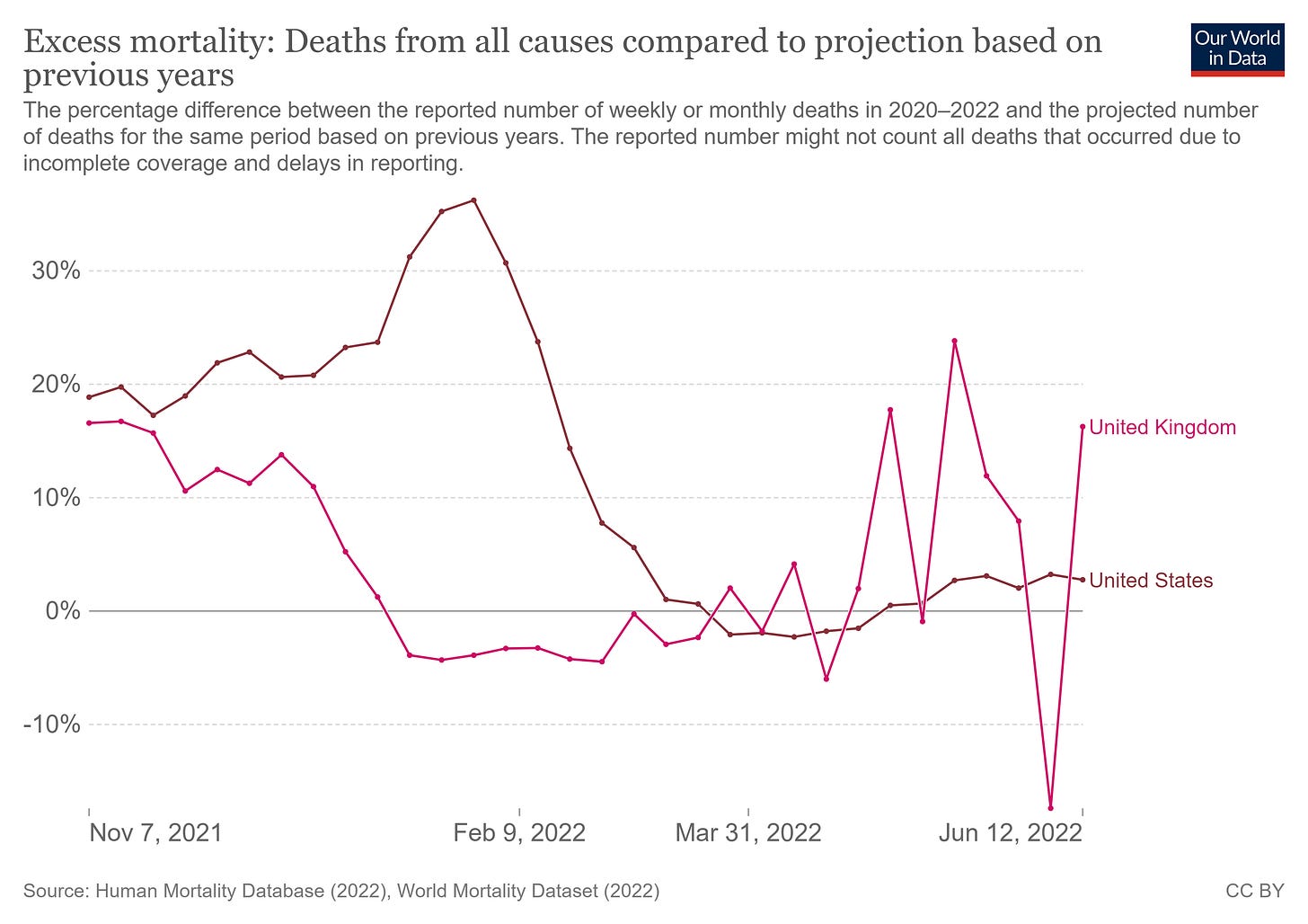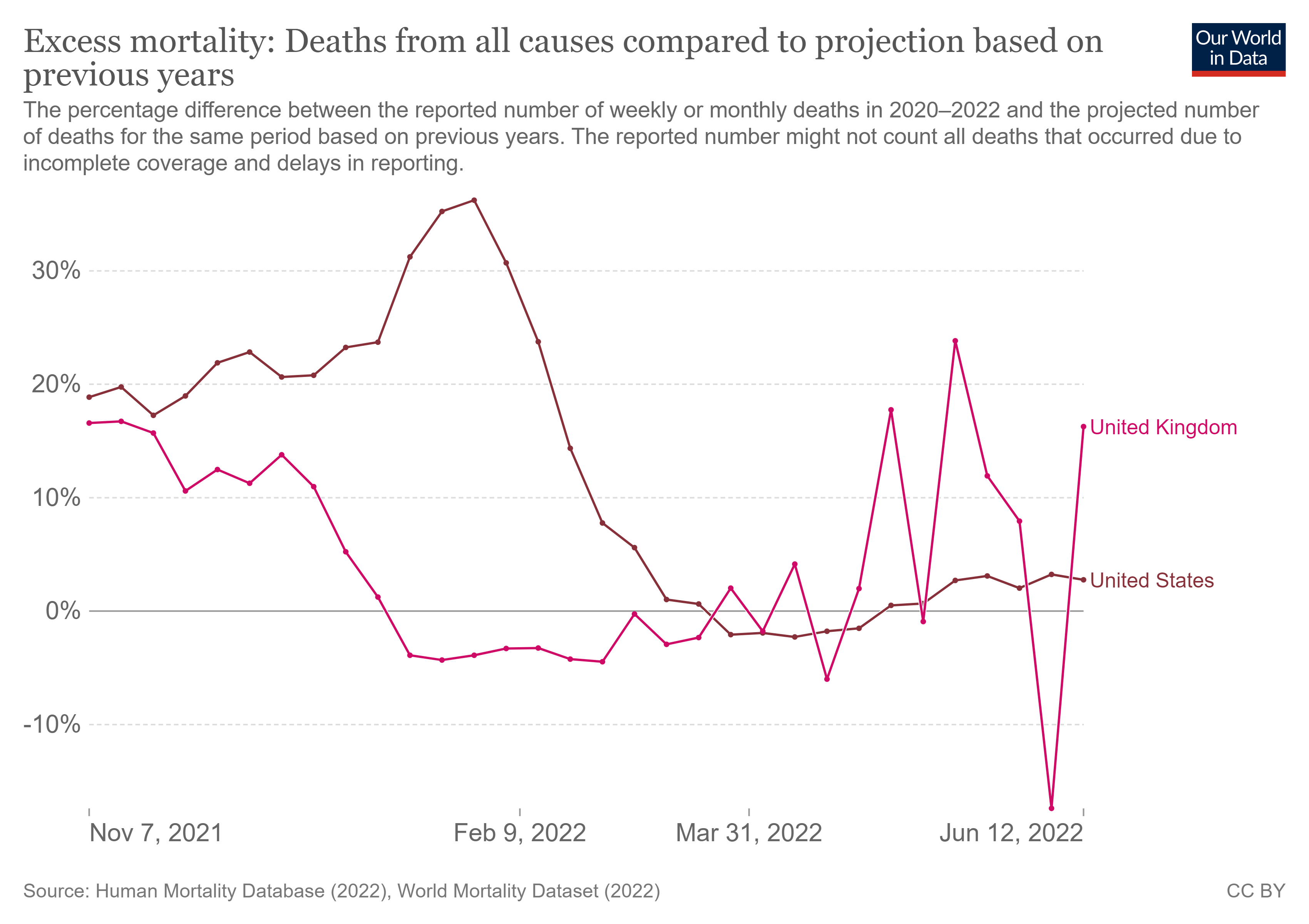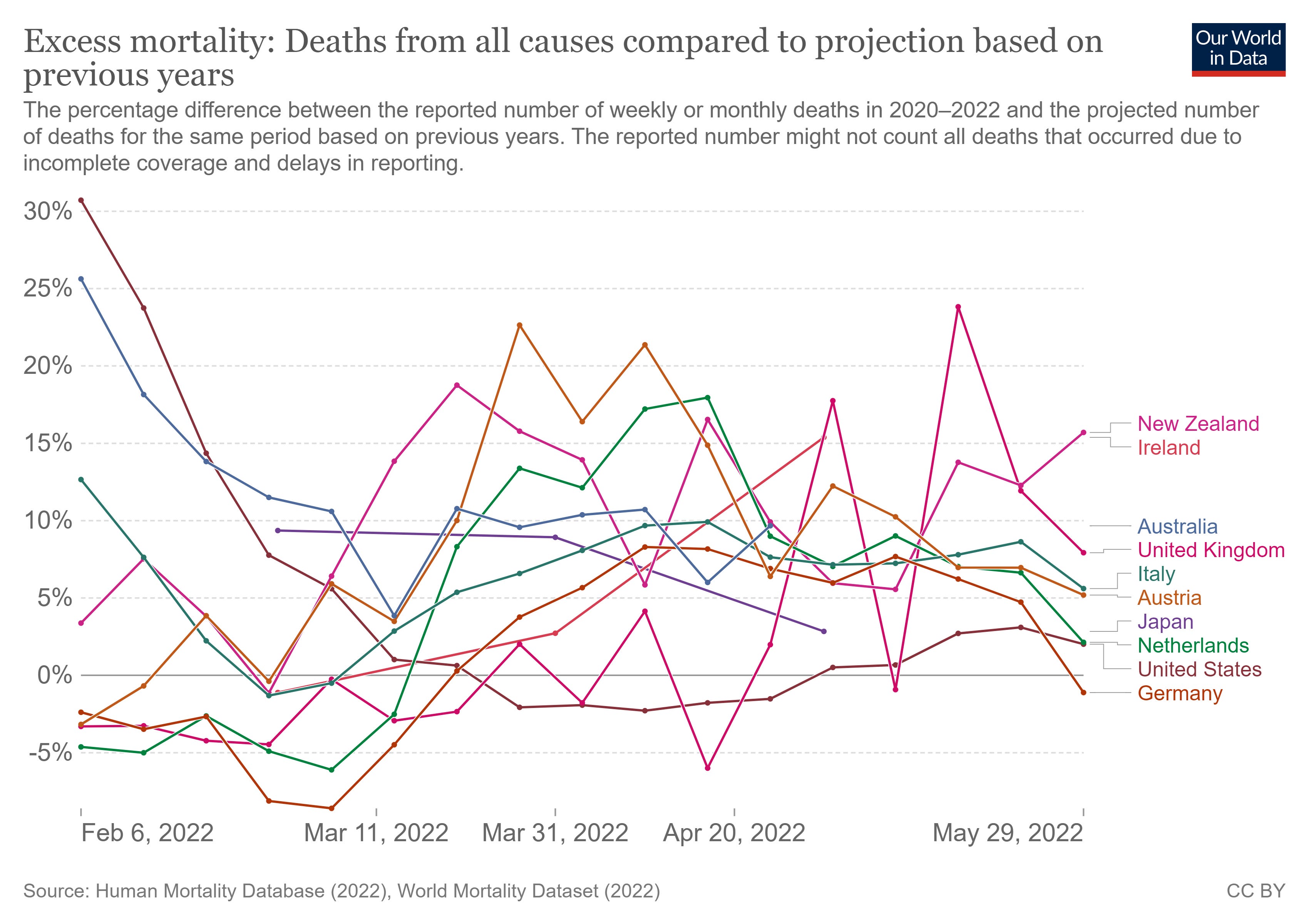 However, it is clear that mortality surges post vaccine and in the 2022 period post boosters, we can see it in the US and in fact, if the low-hanging fruit would have died already (the elderly etc. in 2020), then we would even expect the expected mortality to be much lower. In fact, no excess mortality. Yet we are seeing it in the US and other nations and something is causing these deaths and it is not the virus. Some argue it could be delayed deaths due to people not seeking medical care during 2020 and that this is now playing out. It is likely that some of those delayed deaths may be within the excess mortality, but it is becoming clearer now and across high vaccine nations particularly, that excess deaths are following a pattern that tracks with vaccine. In other words, I am arguing that the COVID gene injection is the driver of these deaths and I am joined by other prominent scientists globally, in this assessment. We have to urgently study this and we must enlist the help of pathologists to assess the exact mortality cause so that we can definitively know why.