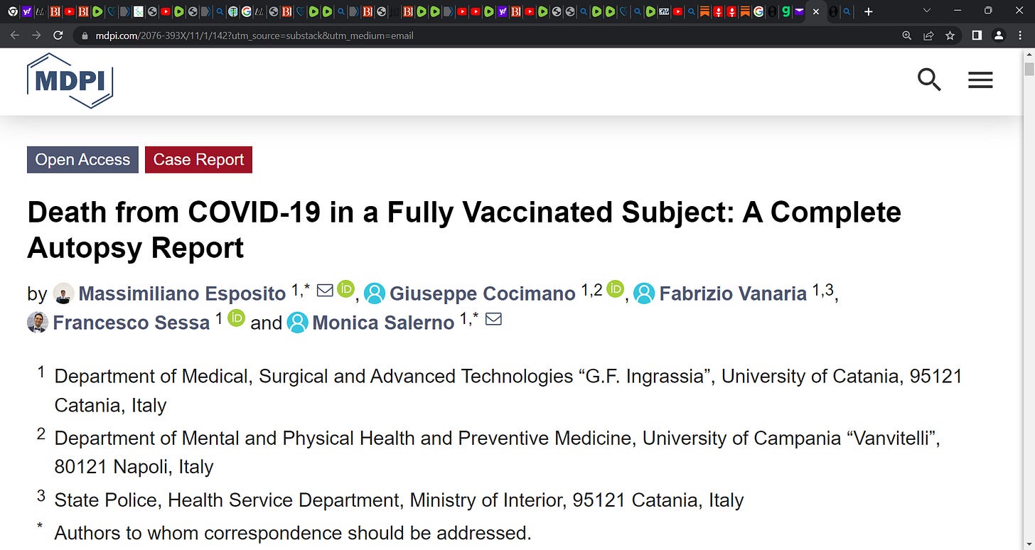 Failure & harms of the COVID mRNA technology based gene injection (Pfizer-BioNTech) & a report of an autopsy; McCullough covers nicely in substack; (Massimiliano Esposito)