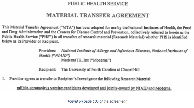 A confidentiality agreement reveals that NIAID and Moderna agreed to transfer “mRNA coronavirus vaccine candidates” to the University of North Carolina at Chapel Hill on December 12, 2019.