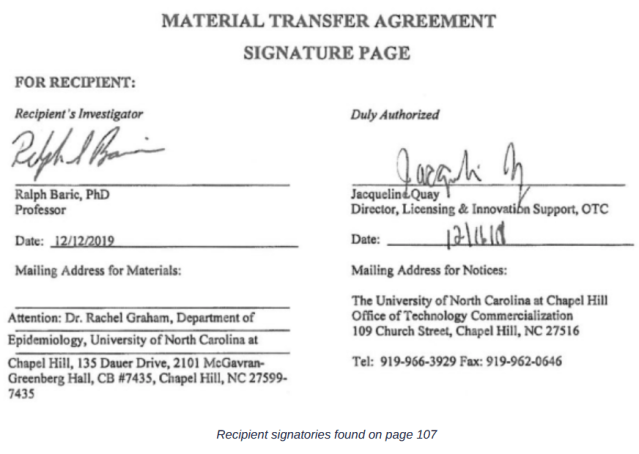 The material transfer agreement was signed the December 12th 2019 by Ralph Baric, PhD, at the University of North Carolina at Chapel Hill, and then signed by Jacqueline Quay, Director of Licensing and Innovation Support at the University of North Carolina on December 16th 2019.