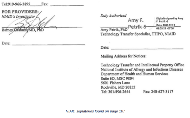 The agreement was also signed by two representatives of the NIAID, one of whom was Amy F. Petrik PhD, a technology transfer specialist who signed the agreement on December 12th 2019 at 8:05 am. The other signatory was Barney Graham MD PhD, an investigator for the NIAID, however, this signature was not dated.