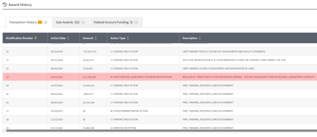 The contract was for a Biological threat reduction program in Ukraine, and concluded in October 2020. While the details are unclear, it is known that $21.7 million of the $116.6 million contract was spent on this program.