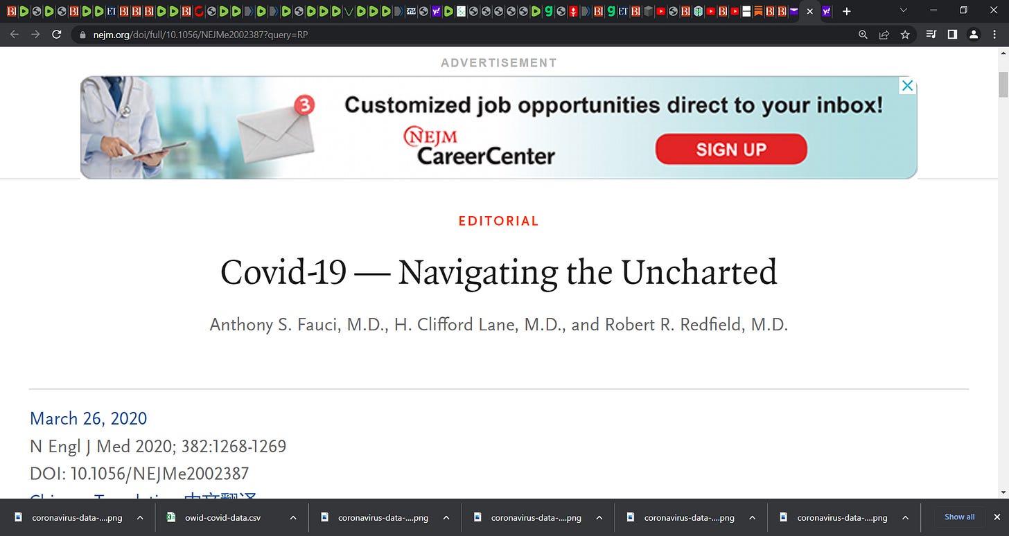 Fauci said what in March 2020? With Redfield? These 2 said that? "This suggests that the overall clinical consequences of Covid-19 may ultimately be more akin to those of a severe seasonal influenza"