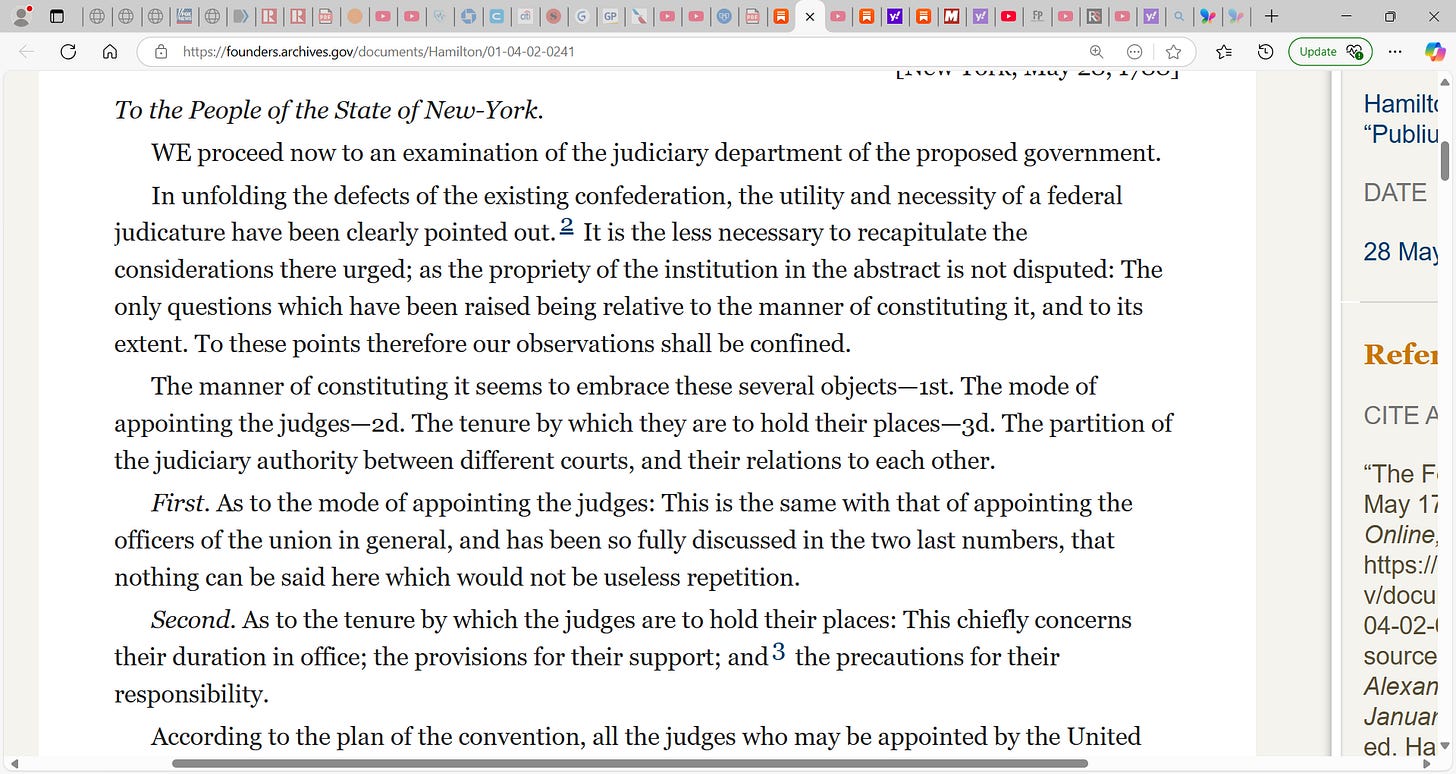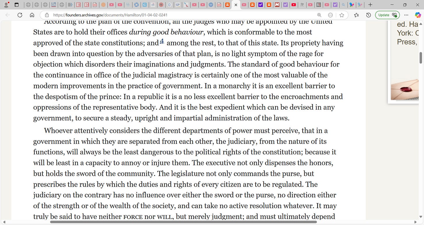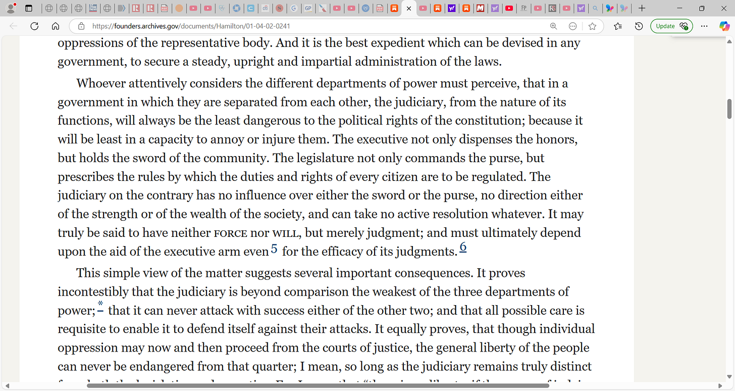 ‘Whoever attentively considers the different departments of power must perceive, that in a government in which they are separated from each other, the judiciary, from the nature of its functions, will always be the least dangerous to the political rights of the constitution; because it will be least in a capacity to annoy or injure them. The executive not only dispenses the honors, but holds the sword of the community. The legislature not only commands the purse, but prescribes the rules by which the duties and rights of every citizen are to be regulated. The judiciary on the contrary has no influence over either the sword or the purse, no direction either of the strength or of the wealth of the society, and can take no active resolution whatever. It may truly be said to have neither force nor will, but merely judgment; and must ultimately depend upon the aid of the executive arm even5 for the efficacy of its judgments.6