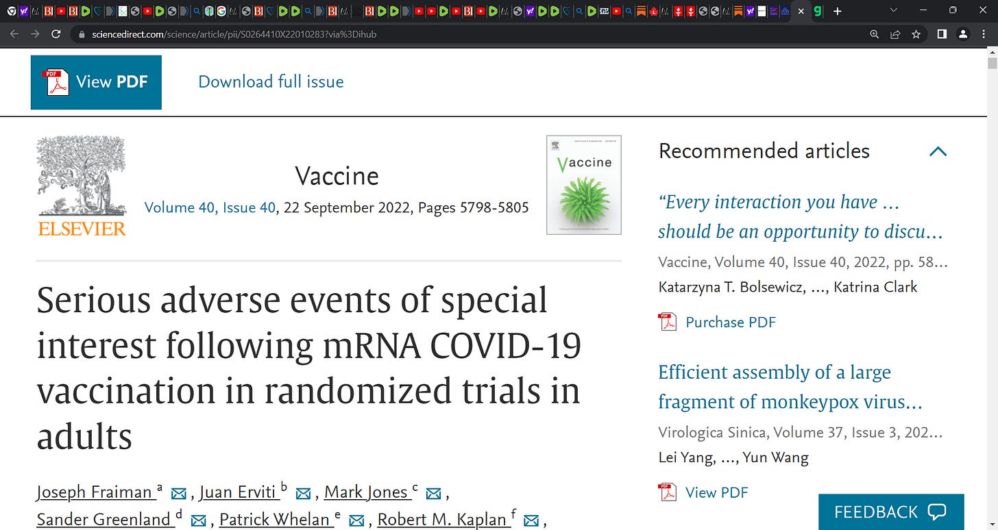 Fraiman et al. showed excess risk of serious adverse events following mRNA technology based COVID gene injections (Pfizer and Moderna); do not forget the government criminals who mandated an unsafe