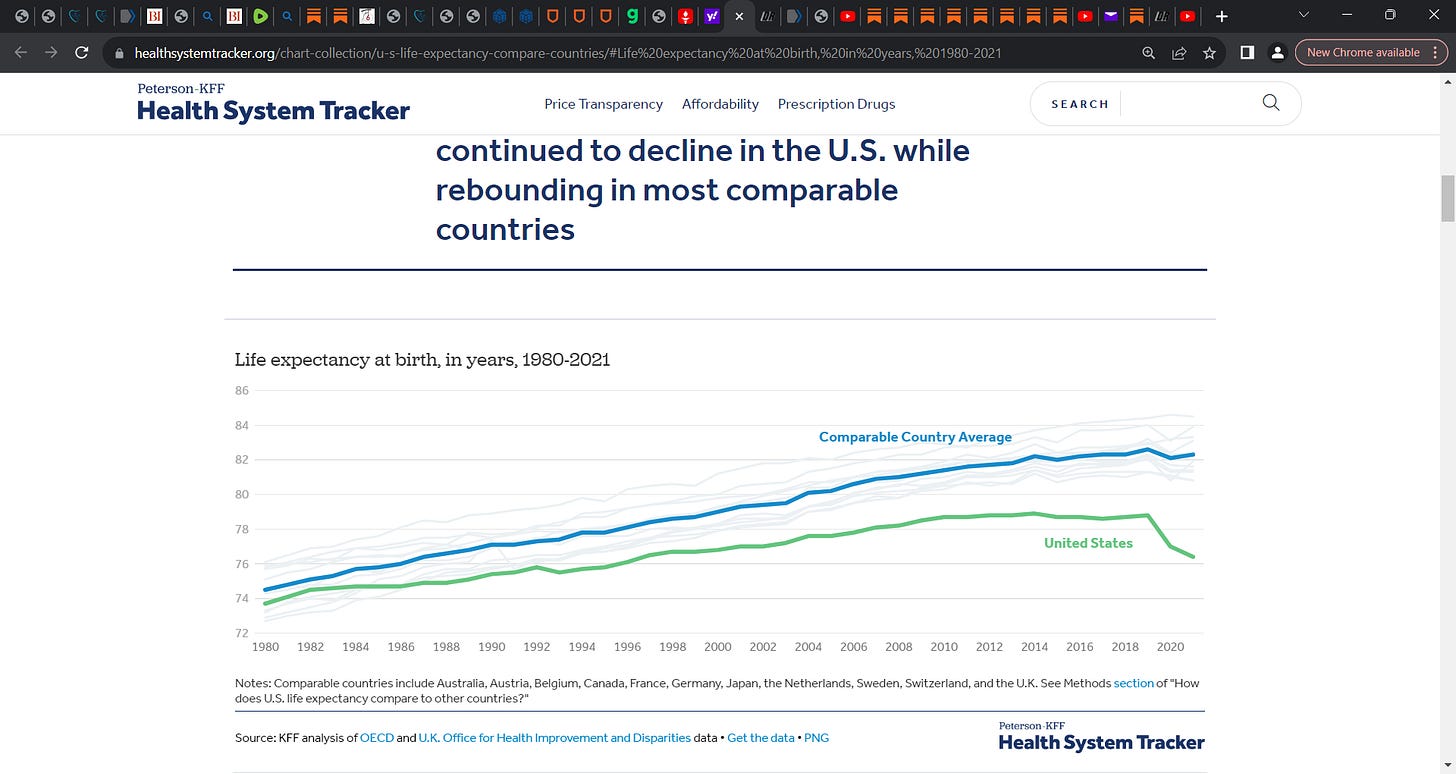 'From 2020 to 2021, life expectancy continued to decline in the U.S. while rebounding in most comparable countries!' But why? Now post COVID it is 6 years shorter! Why? America spends many times more