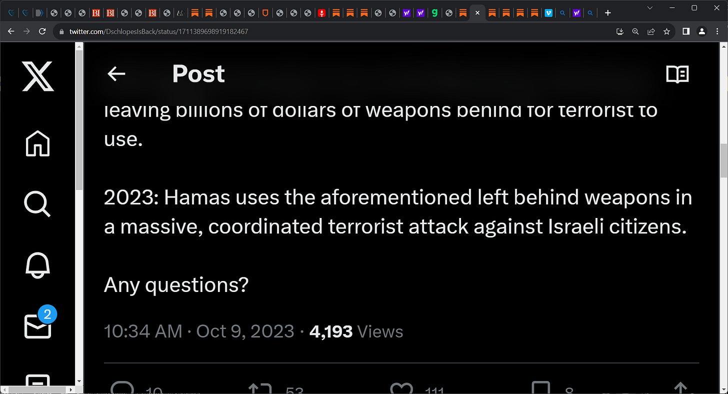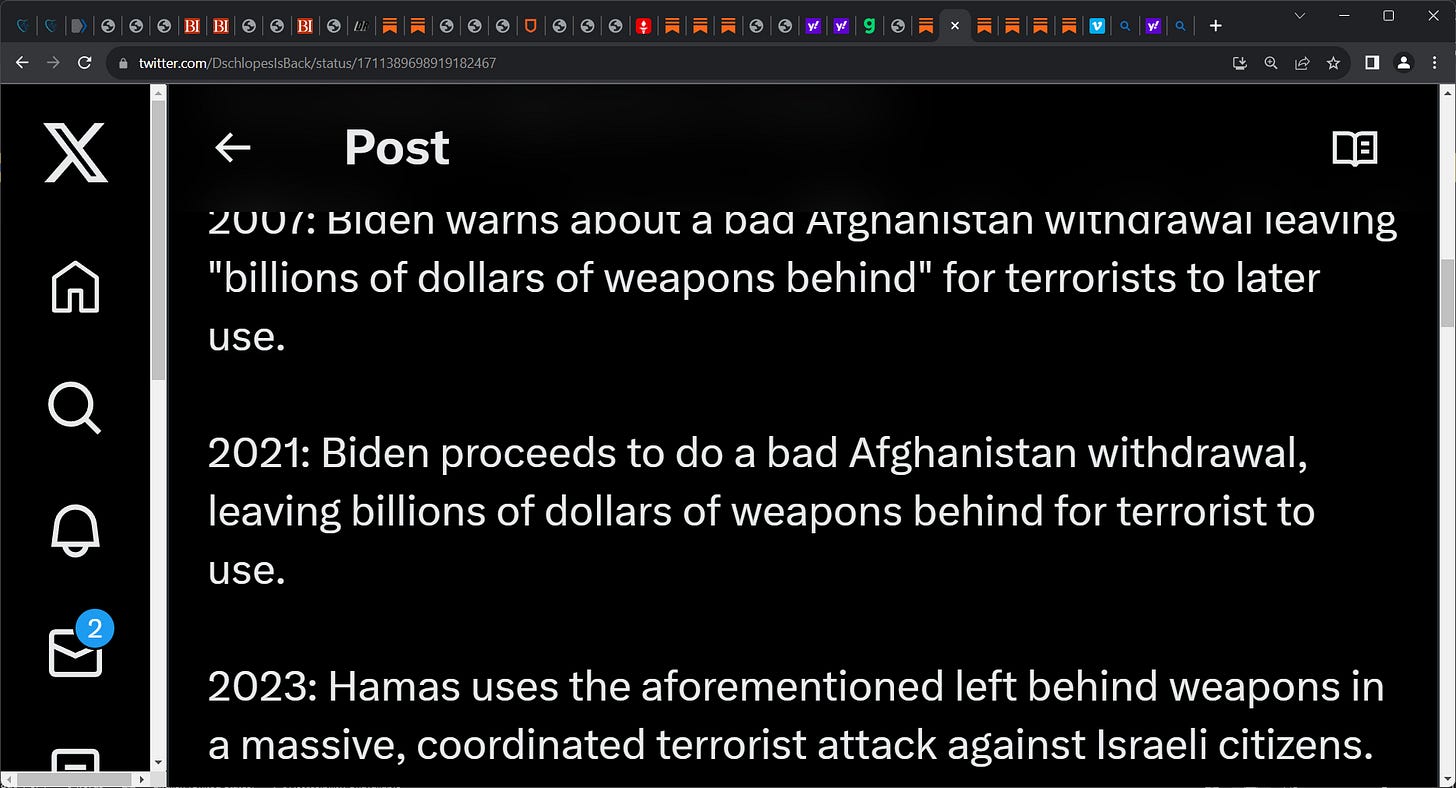 withdrawal leaving "billions of $ of weapons behind" for terrorists. 2021: Biden proceeds to do a bad Afghanistan withdrawal, leaving billions of dollars of weapons. 2023: Hamas uses weapons on Israel