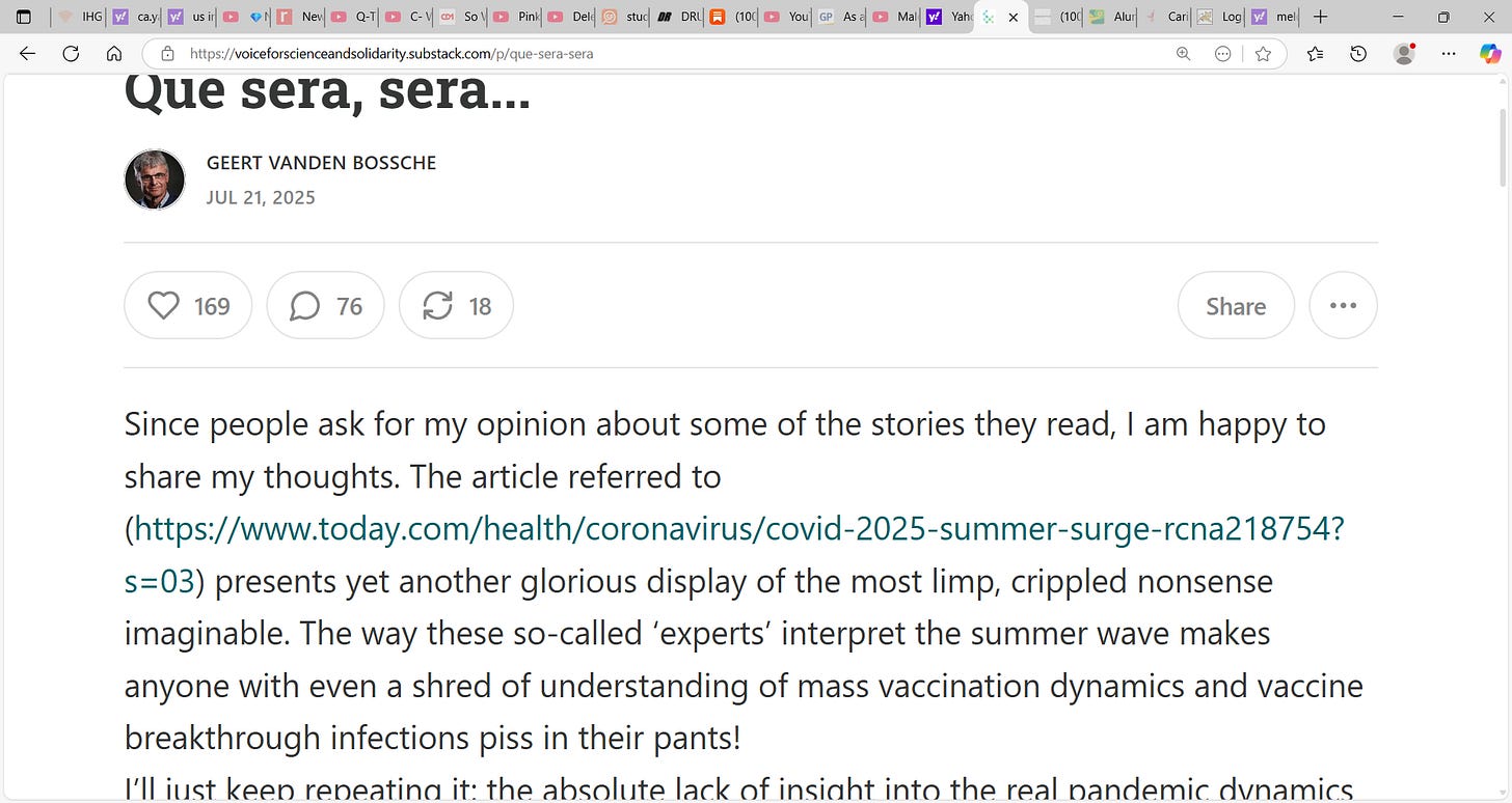 Geert Vanden Bossche (shared by Dr. A Brinkley) again takes us on a needed immunological tour of the catastrophe of the Malone Bourla et al. transfection injection! 'Que sera, sera'...governments and