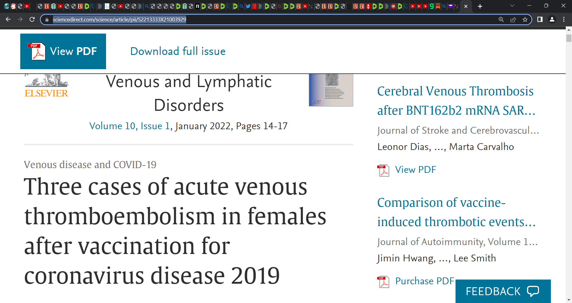 Thrombotic complications have been reported after vaccine administration, which were primarily cerebral sinus thromboses after administration of the viral vector vaccines. To the best of our knowledge, we are the first to report venous thrombotic complications within days of administration of the mRNA-1273 (Moderna) vaccine. We present a series of three women who developed venous thromboembolism after RNA-1273 vaccination at a single healthcare system.’ This underscores that we have to be concerned and be alert to the adverse effects of these mRNA and viral vector injections.