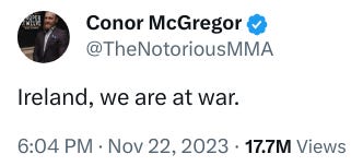 Go Conor McGregor, GO! The man who would be KING of Ireland now, he is going to take his CROWN! He has shown the gonads needed' "if you don't act soon to ensure Ireland's safety, I will" BOOM! After