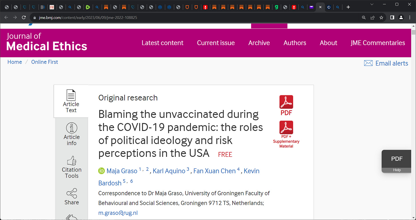 Graso's 'scapegoating' BMJ research finds people hold the unvaccinated (vs vaccinated) more responsible for negative pandemic outcomes and that political ideology moderated these effects: liberals (vs