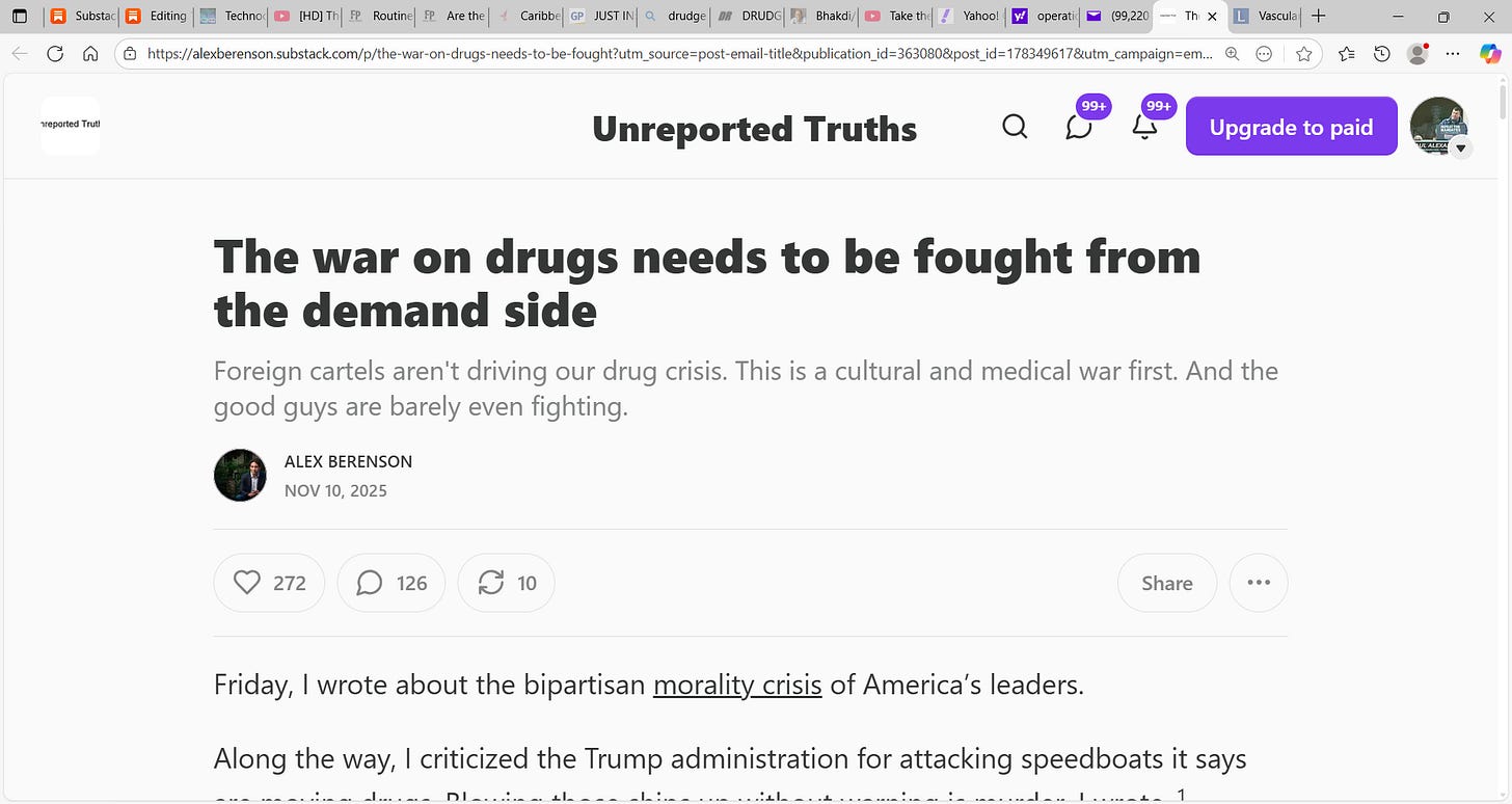 Hat-tip to Berenson for this substack titled "The war on drugs needs to be fought from the demand side; Foreign cartels aren't driving our drug crisis. This is a cultural and medical war first." he