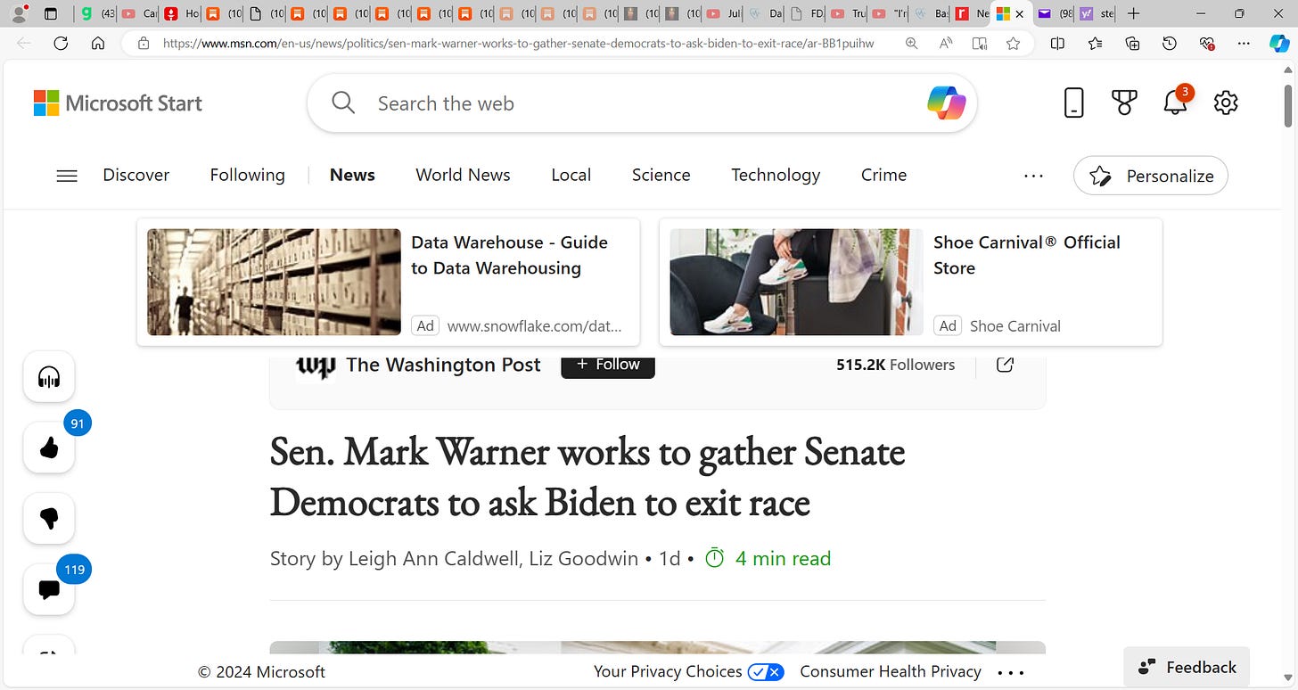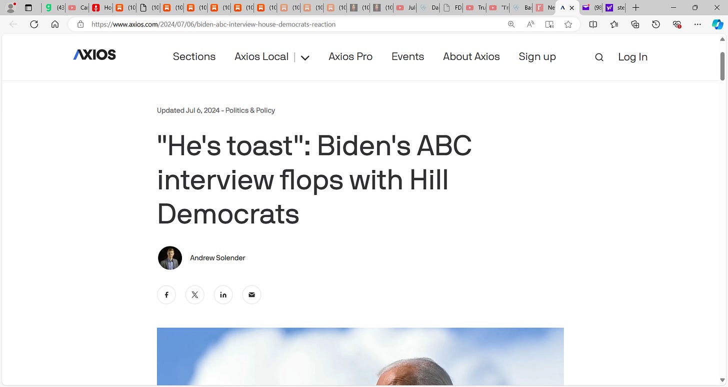 'He is toast, game over'! That is the view now for Biden by top democrats, even after the disastrous Stephanopoulos: "He's toast": Biden's ABC interview flops with Hill Democrats; President Biden's