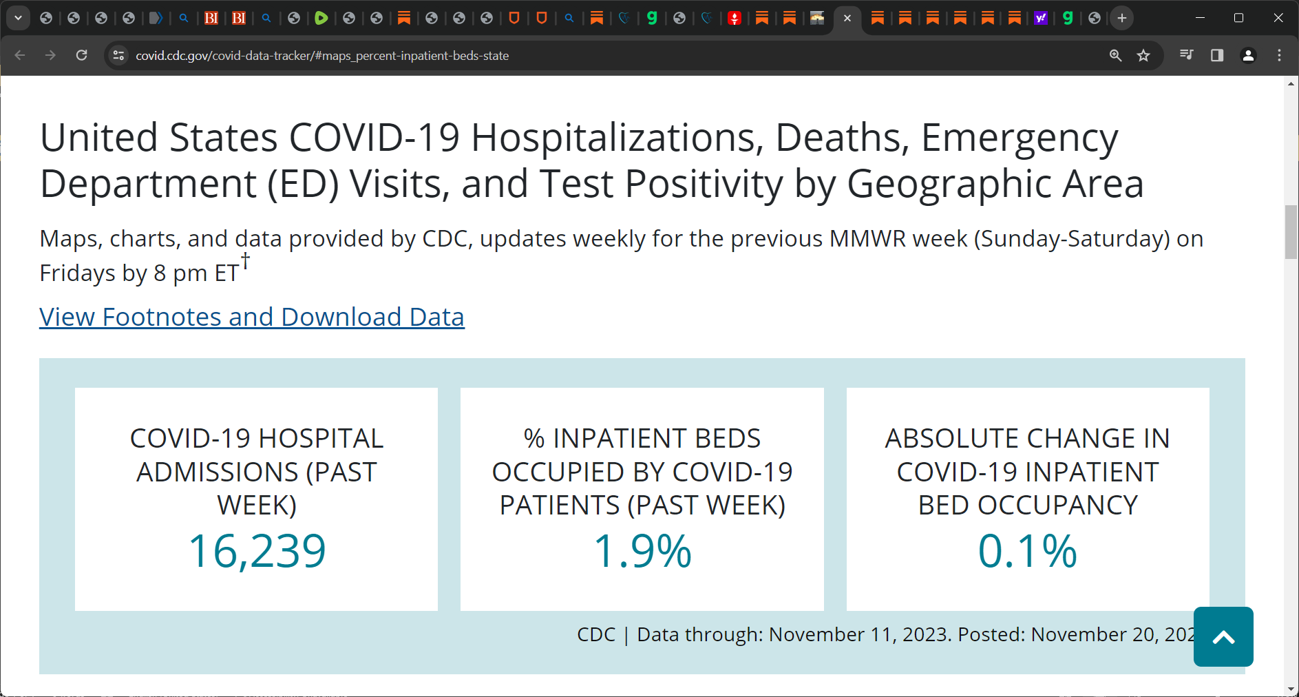Hhhhmmm, less that 2% (1.9%) of HOSPITAL INPATIENT BEDS IN AMERICA OCCUPIED BY COVID-19 PATIENTS (PAST WEEK) (see CDC data below, up to November 11th 2023), but then why are they rolling out the NEW