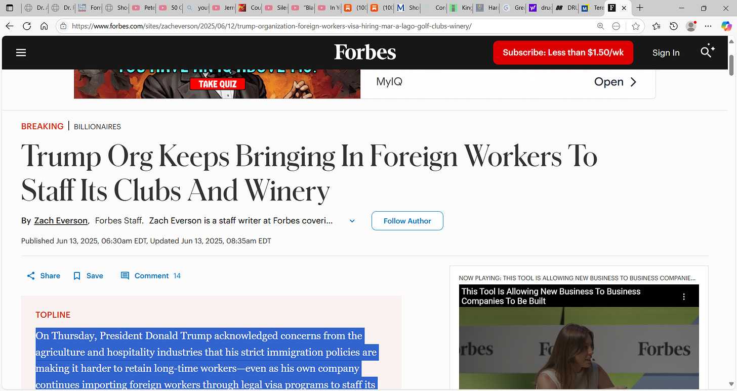 hhmmm 'Trump Org Keeps Bringing In Foreign Workers To Staff Its Clubs And Winery'; On Thursday, President Donald Trump acknowledged concerns from the agriculture and hospitality industries that his