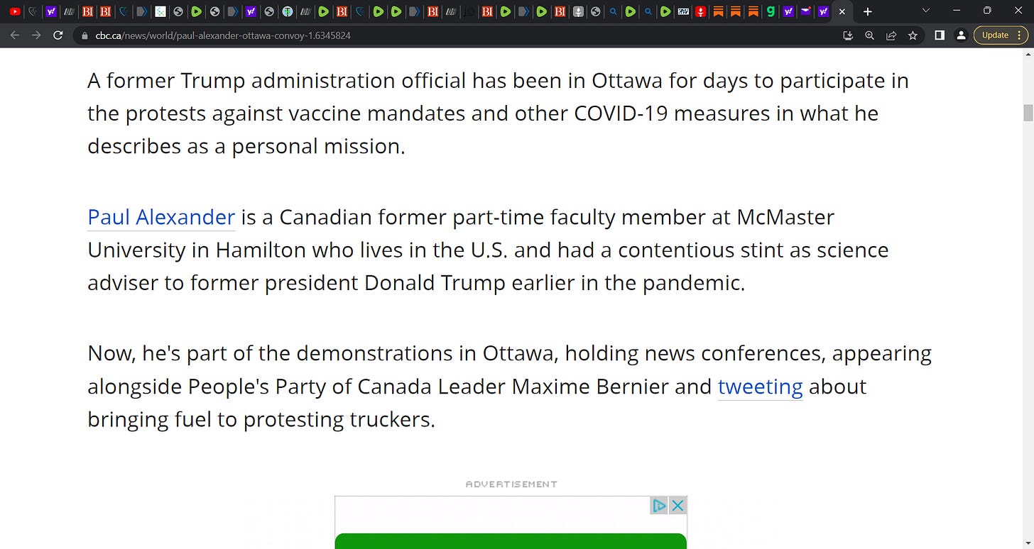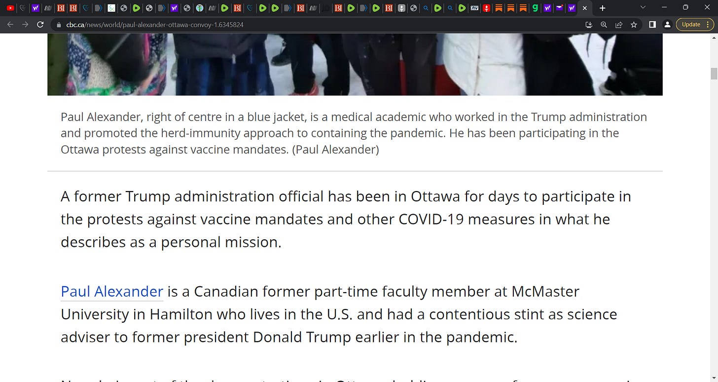 How a former Trump official (Dr. Paul Elias Alexander) wound up at Ottawa's trucker convoy protest, leading it on stage on Parliament Hill, drawing anger from the liberal government