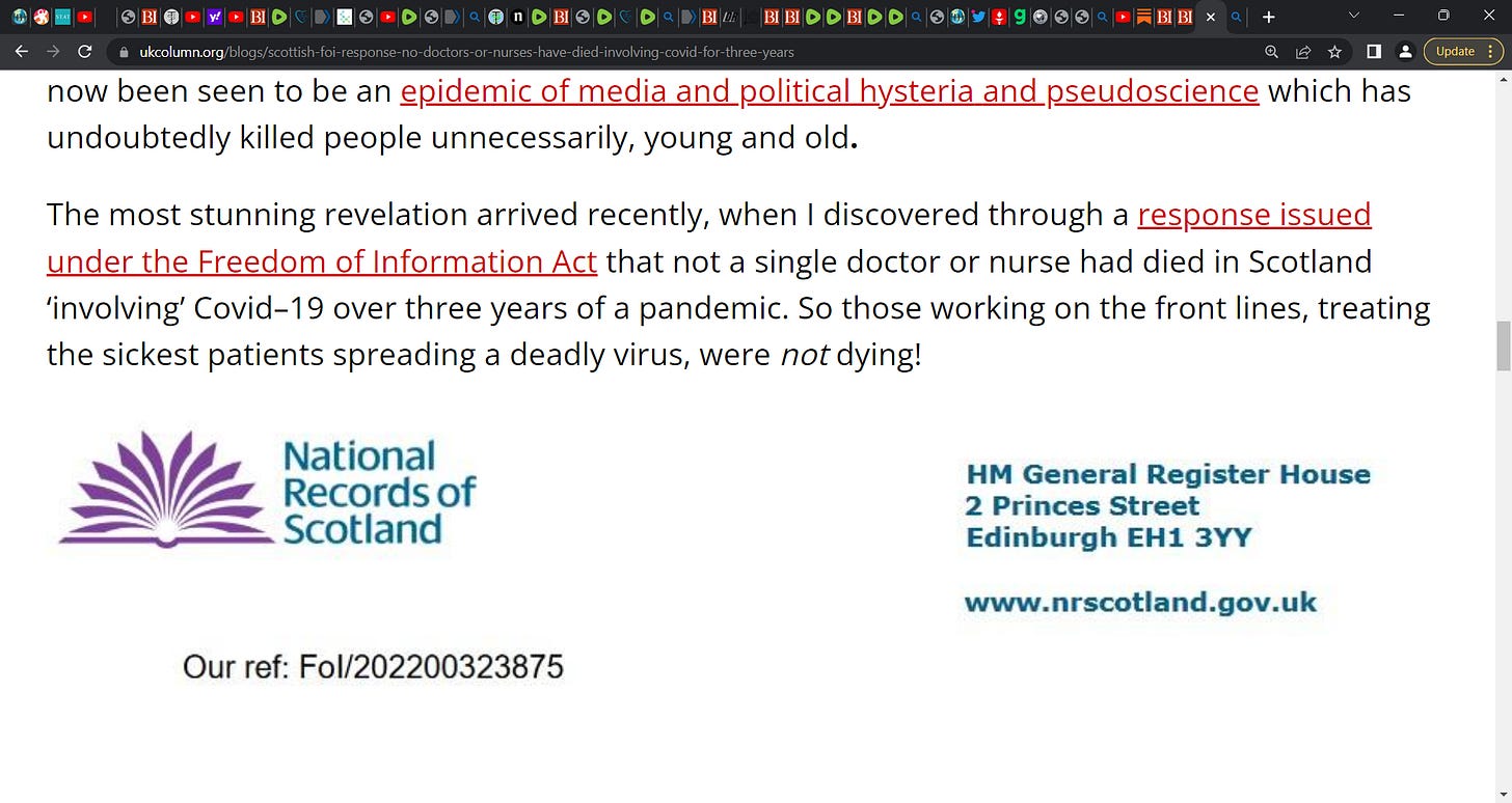 Huh? Zero deaths in Scotland due to COVID in doctors and nurses? For all 3 years? That is actually TRUE! 'Scottish FoI response: NO doctors or nurses have died ‘involving’ Covid for three years'