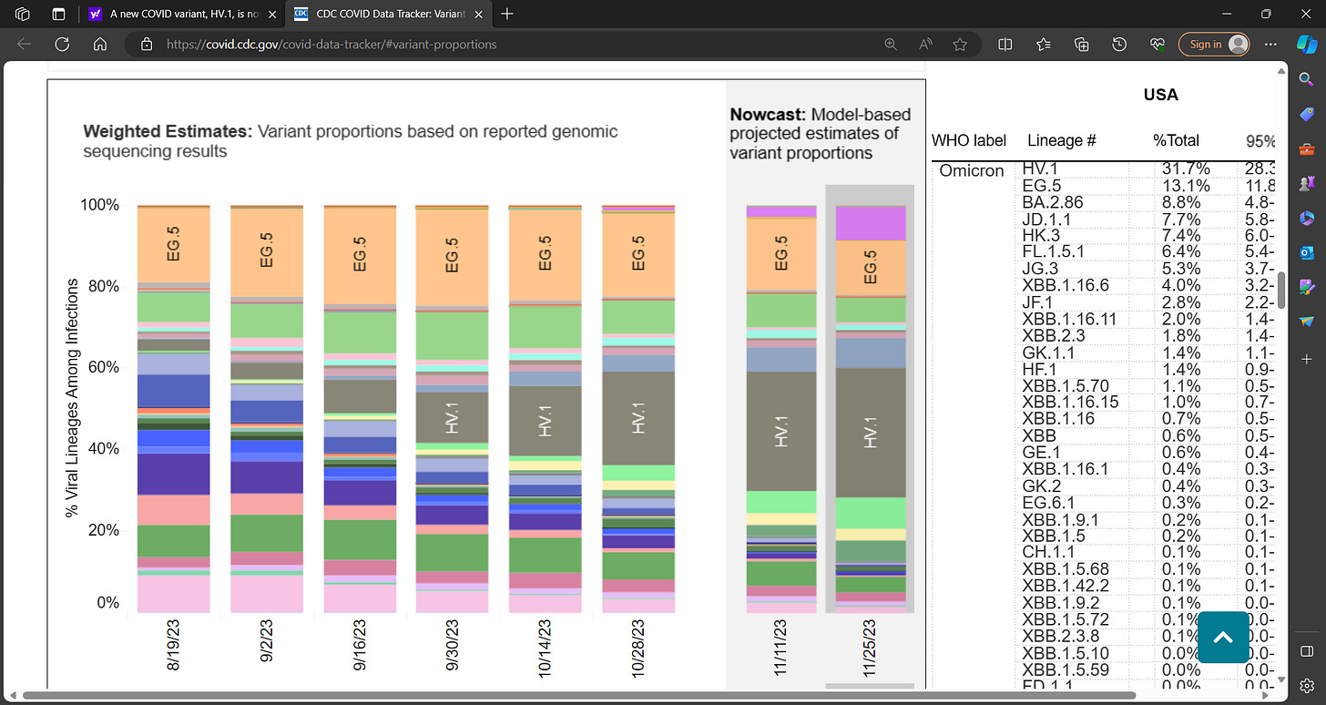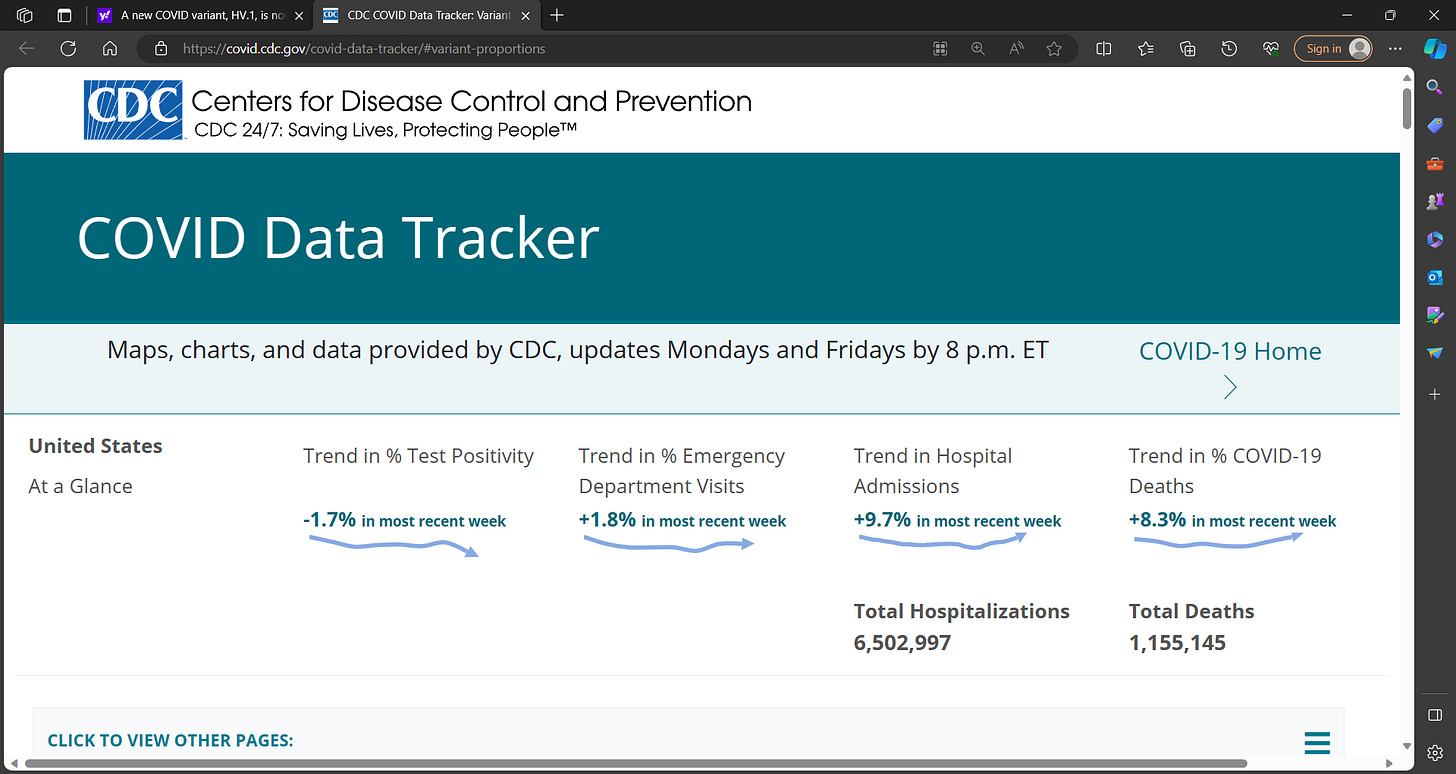 HV.1 COVID sub-variant (as pr CDC data below) may be more transmissible but no alarm bells; no data, no evidence HV.1 causes more severe disease or more hospitilization etc.; common sense, precautions