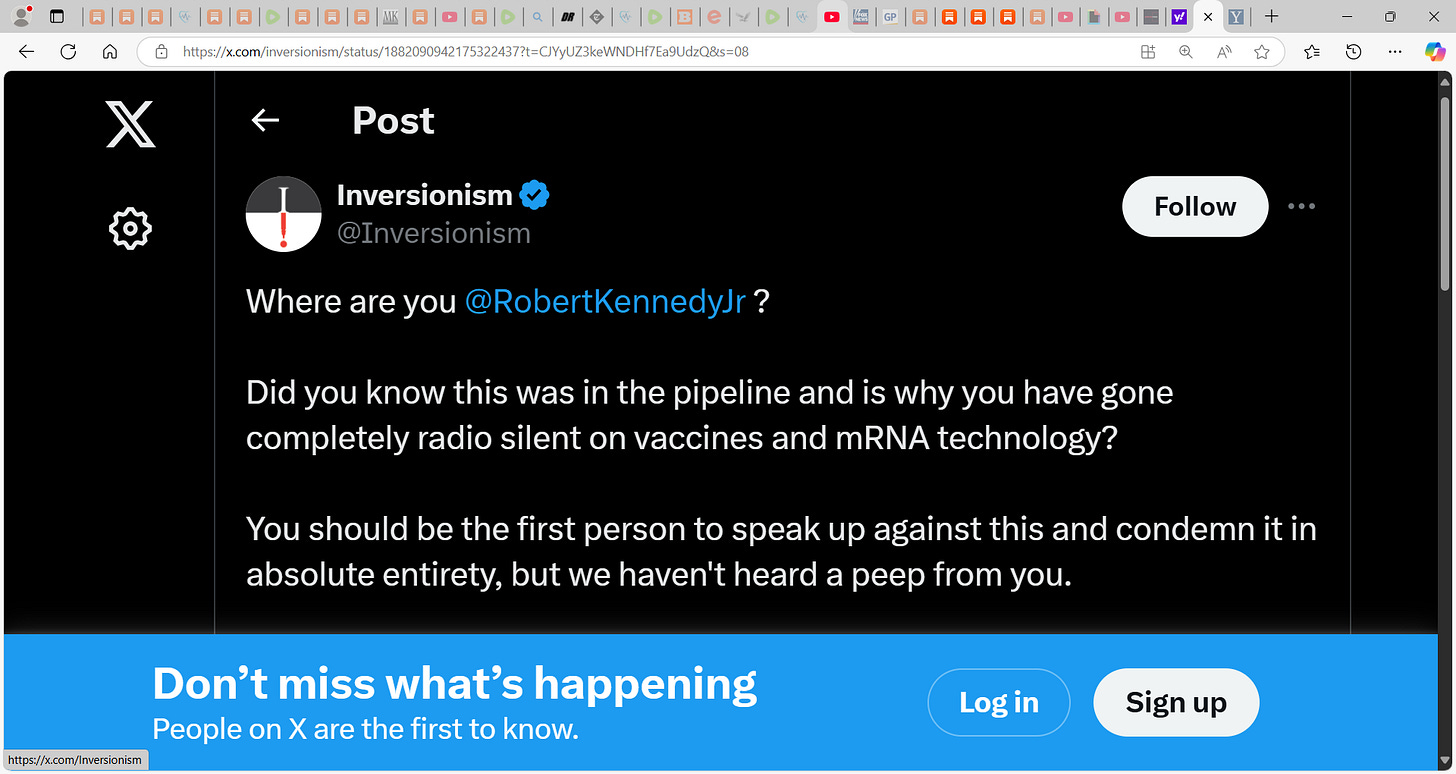 I have to agree with Inversionism who writes on X: "Where are you @RobertKennedyJr? Did you know this was in the pipeline and is why you have gone completely radio silent on vaccines and mRNA tec