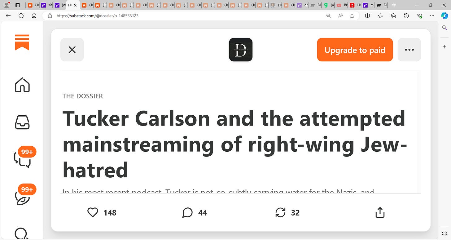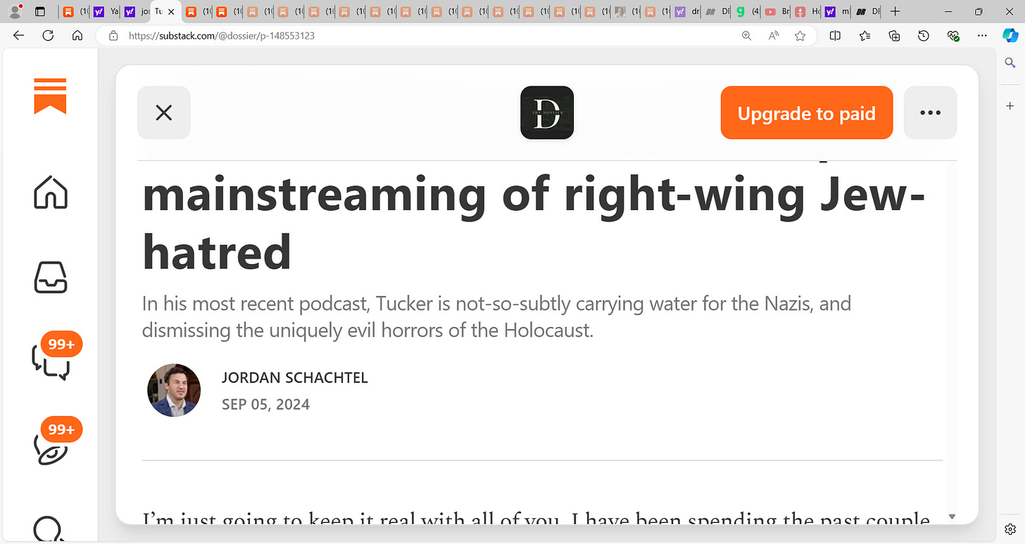 I don't think Tucker is an anti-semite and I like his work, I think a key part of our national debate, but be careful Tucker, do not mainstream this gaslighting and specious drivel, this dangerous talk by these Nazi apologists…do not give audience to the anti-Israel hatred and you should have had someone on the other side to have the debate. I don’t want anti-arab hatred on your show just as much…no anti-muslim hate or anti-Jew hate or anti-Christian hate or anti-Hindu hate…there are serious often deadly dangerous issues at play and we need solid balanced debate to etch out a reasonable safe vision of the future…I admire Tucker, he is smart, but I also thought Tucker’s interview with Darryl Cooper was misguided. But then again, it is his show and it is his right. This though is my opinion.