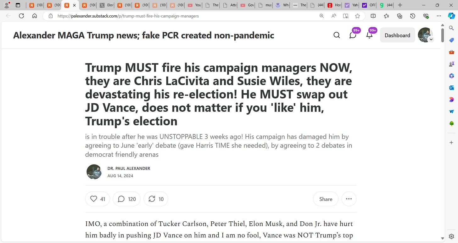 Vance has not done for Trump what a VP should have and lots of it self-inflected. I do not wish to get into it, I just want the BEST ticket and this is NOT it.