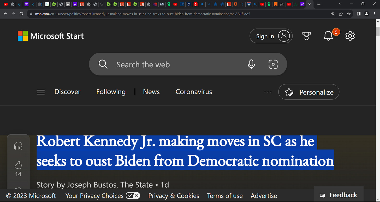 I will help Bobby Kennedy Jr. defeat Biden for the democrat nomination; ideally, I won't mind him on Trump's ticket!! "Robert Kennedy Jr. making moves in SC as he seeks to oust Biden for nomination"