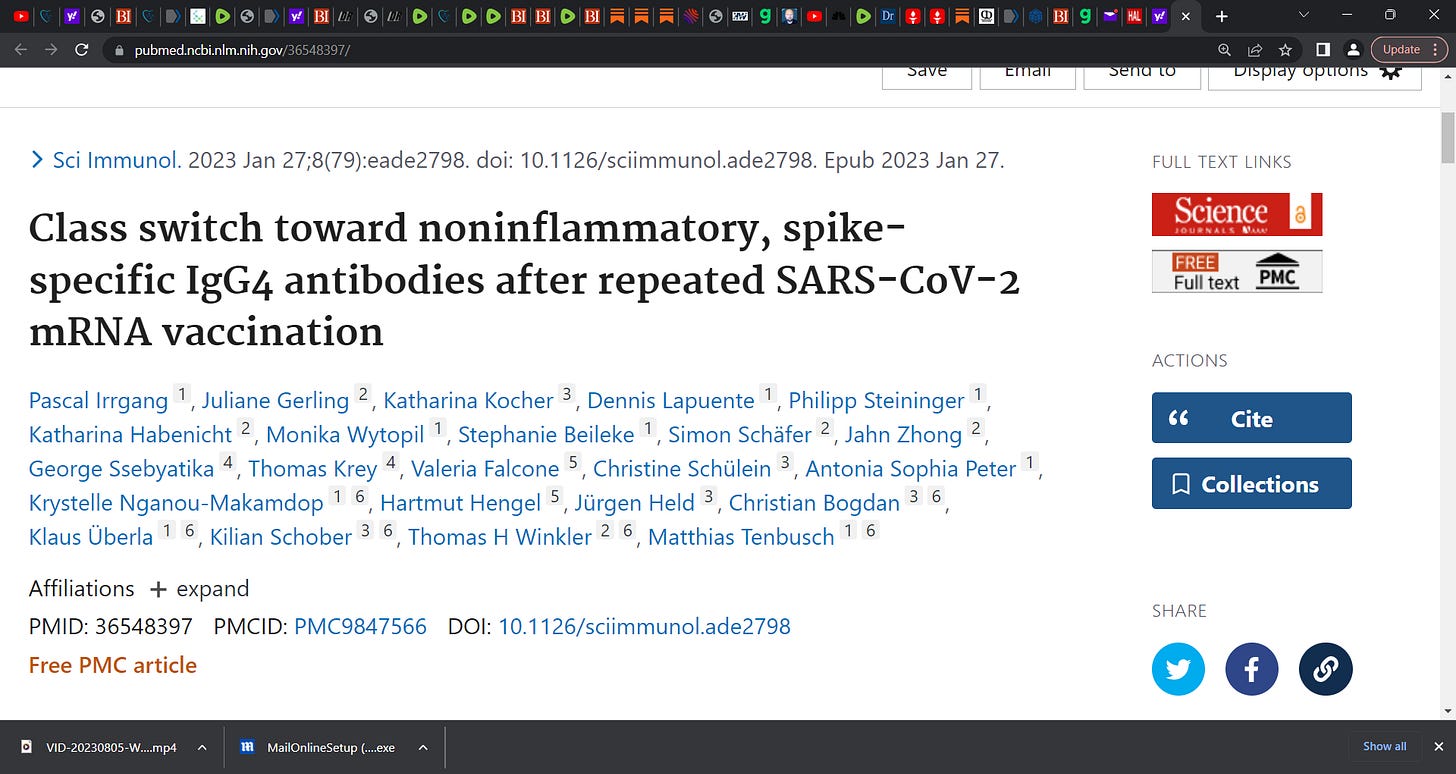 IgG4 'class switch' (Irrgang et al.) toward noninflammatory, spike-specific IgG4 antibodies after repeated COVID mRNA vaccination; a problem for mRNA technology based gene injected vaccinees? YES!
