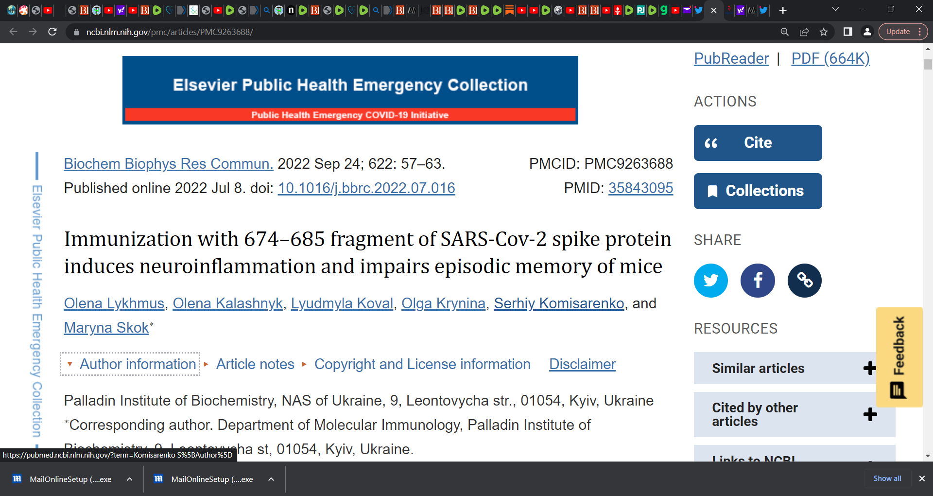 Immunization/injecting with 674–685 fragment of SARS-Cov-2 spike protein induces neuroinflammation and impairs episodic memory of mice ( Dr Henry Ealy shared with me); post-COVID memory impairment