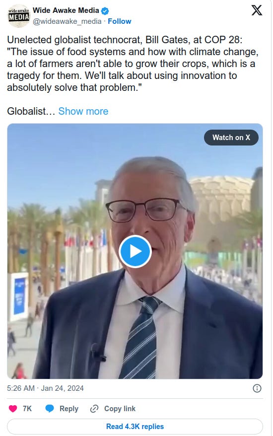 In the future, Gates also wants to strip farmers of being able to grow their own food. At the recent COP28 meeting of elitist globalists, Gates unveiled a strategy involving the use of "innovation to absolutely solve that problem."